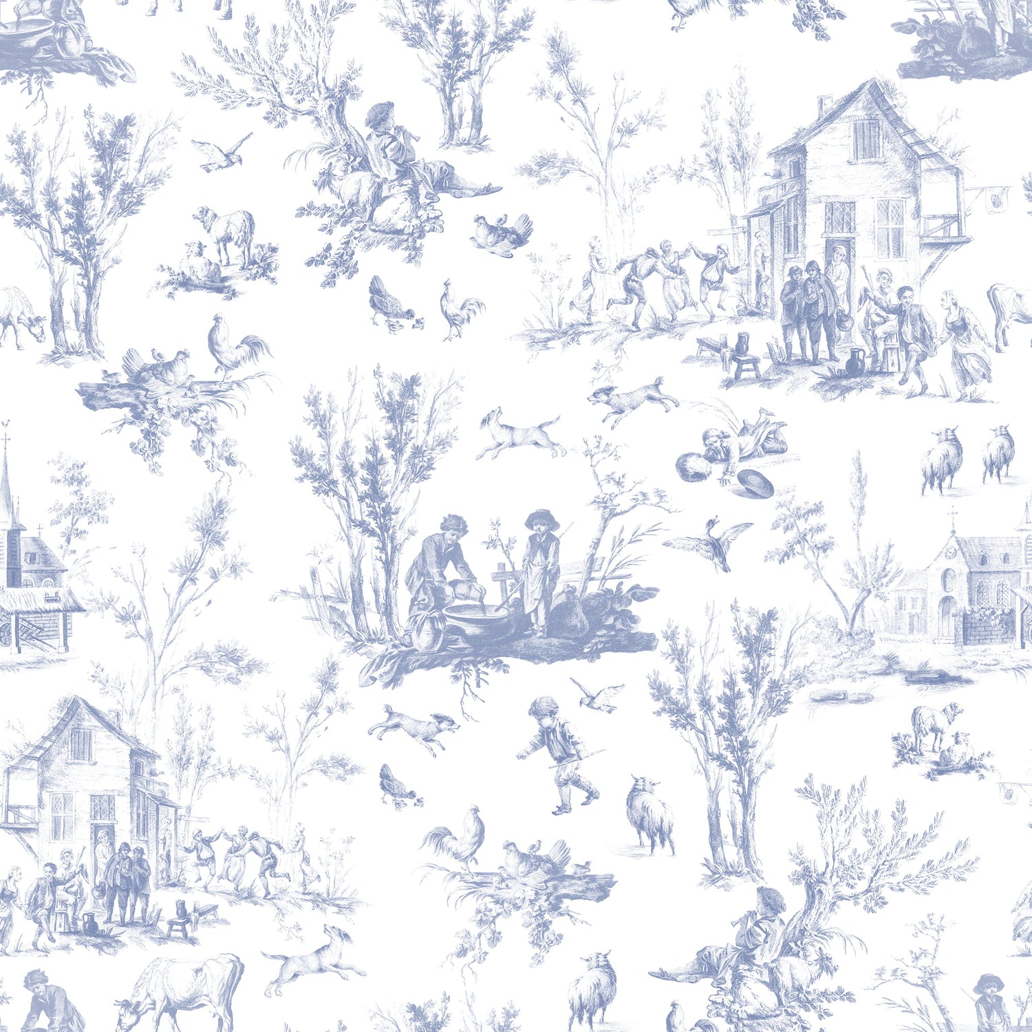 Step into the heart of 18th-century French country life with this enchanting Blue Village Toile wallpaper by Uta Naumann. Soft cornflower blue illustrations on a crisp white ground depict a lively pastoral world - villagers dancing outside cottages, farmers at work, shepherds resting beneath spreading trees, and country churches with slender steeples. Sheep, cows, goats, roosters, and hens roam freely while birds take flight overhead.