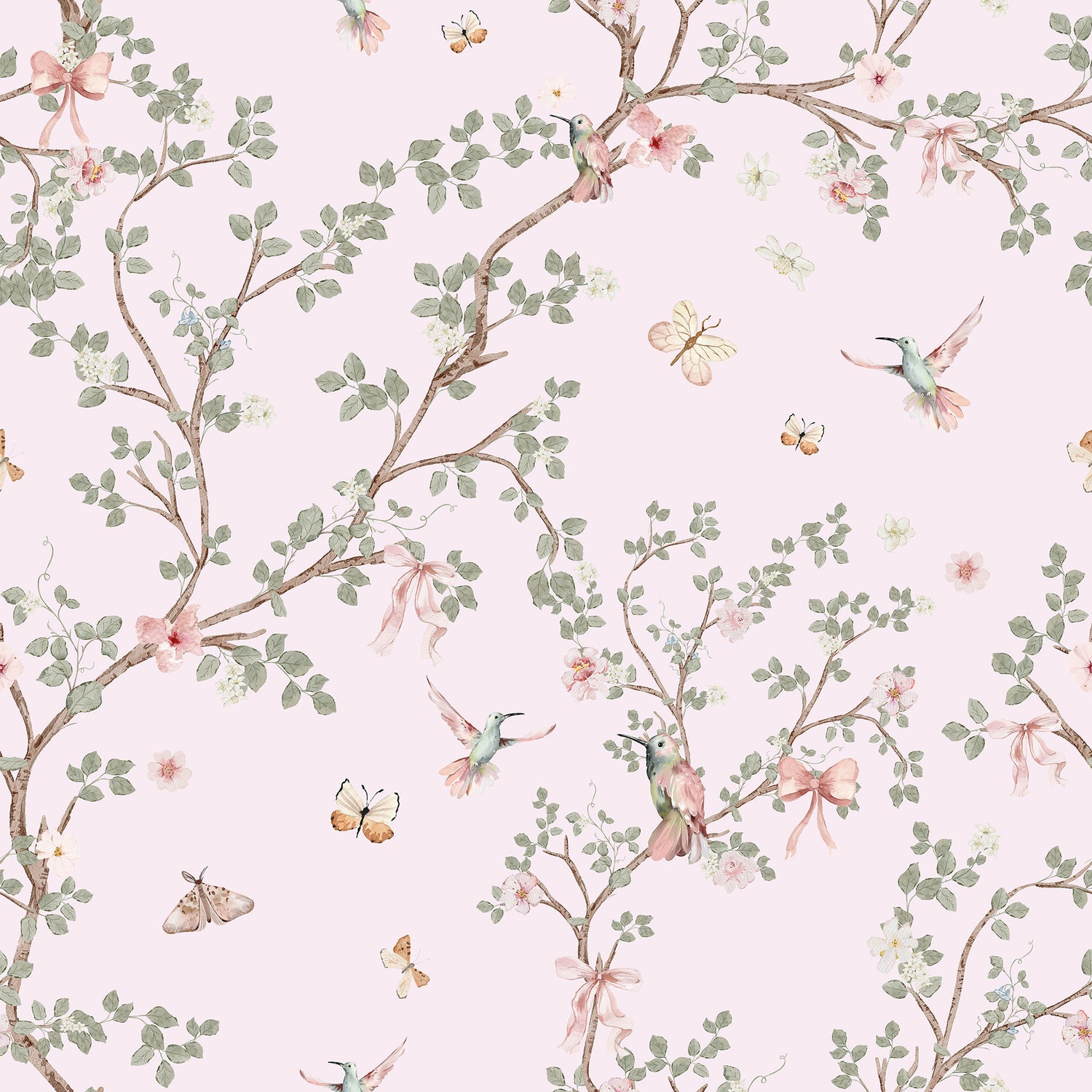Float into a softer, sweeter world with this Pink Chinoiserie Hummingbird wallpaper by Uta Naumann. Set against a dreamy blush pink background, gracefully winding branches bloom with tiny white flowers and sage green leaves - home to pastel hummingbirds in mid-flight and at rest. Delicate pink satin bows tie the scene together, while cream and peach butterflies flutter between the blossoms. It's a design that feels like a hand-painted watercolor come to life.
