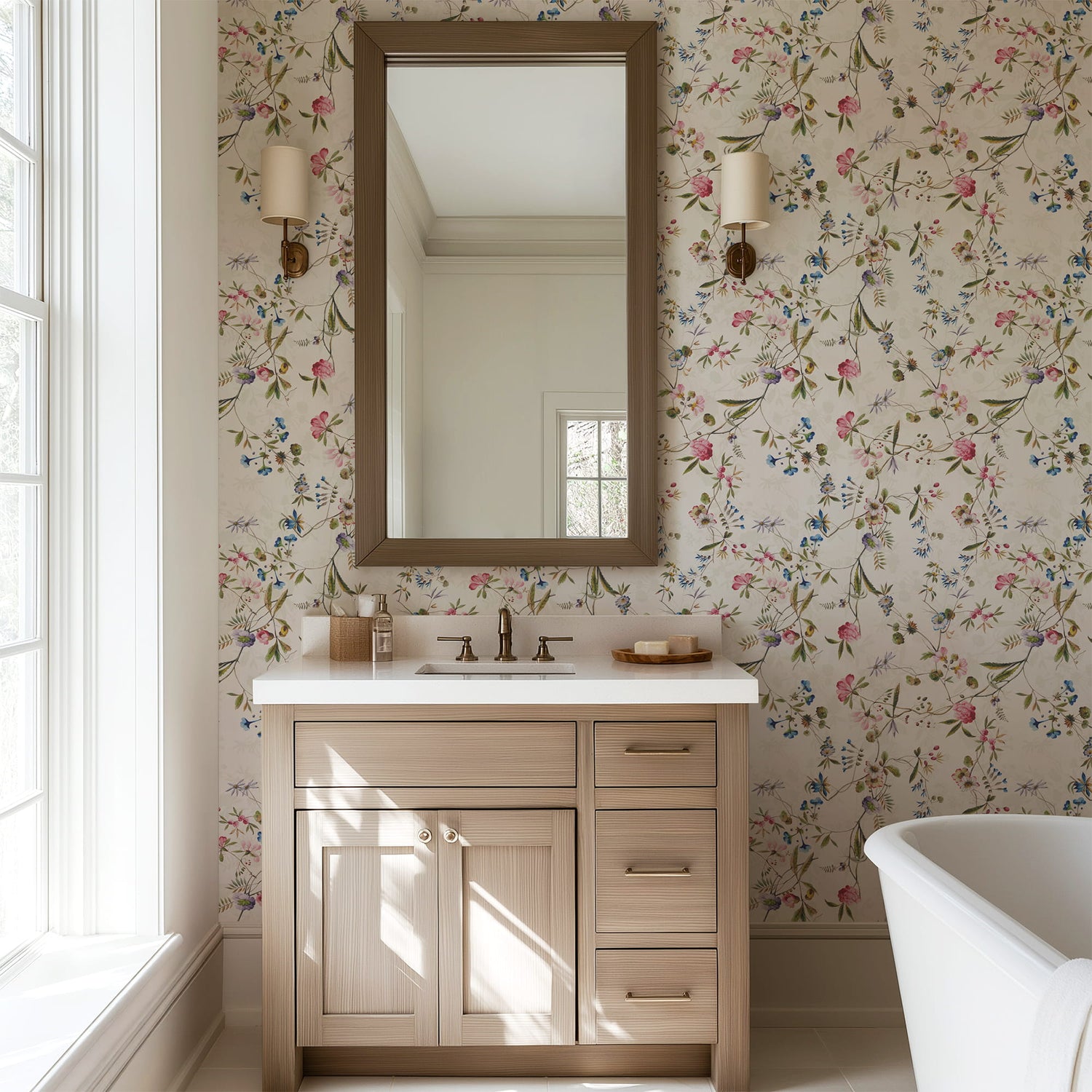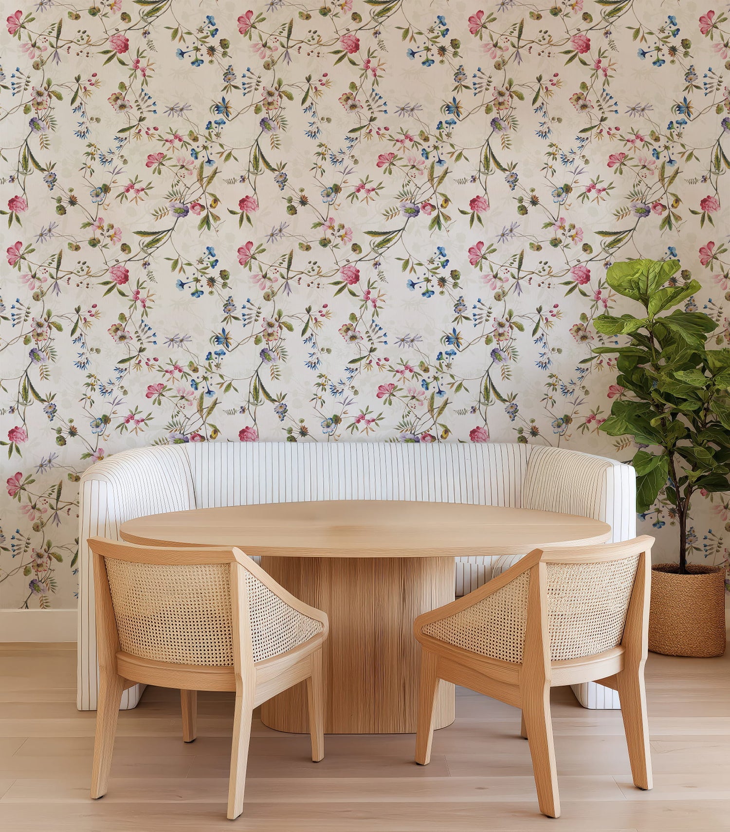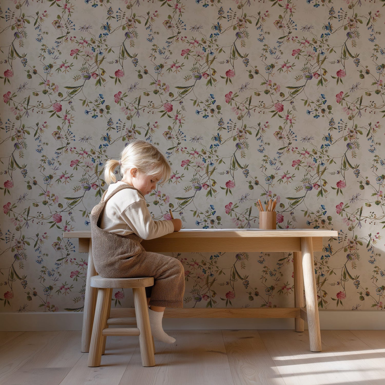 Inspired by antique botanical journals and vintage chintz fabrics, this design has a timeless storybook quality that works beautifully in bedrooms, nurseries, dining rooms, breakfast nooks, powder rooms, and sunrooms. The soft multi-color palette pairs effortlessly with natural wood, linen upholstery, rattan, brass accents, cream trim, and both traditional and cottage-inspired interiors.
