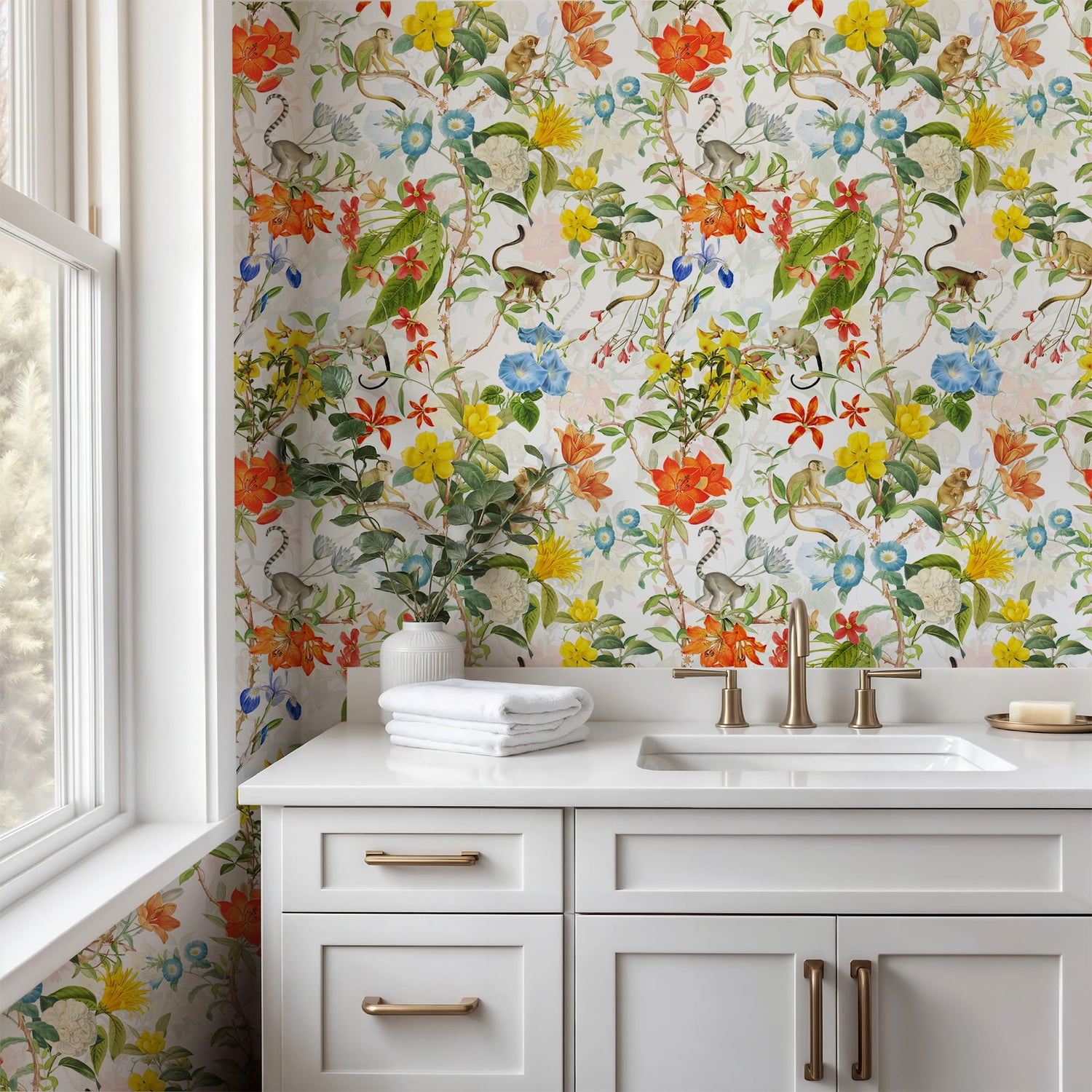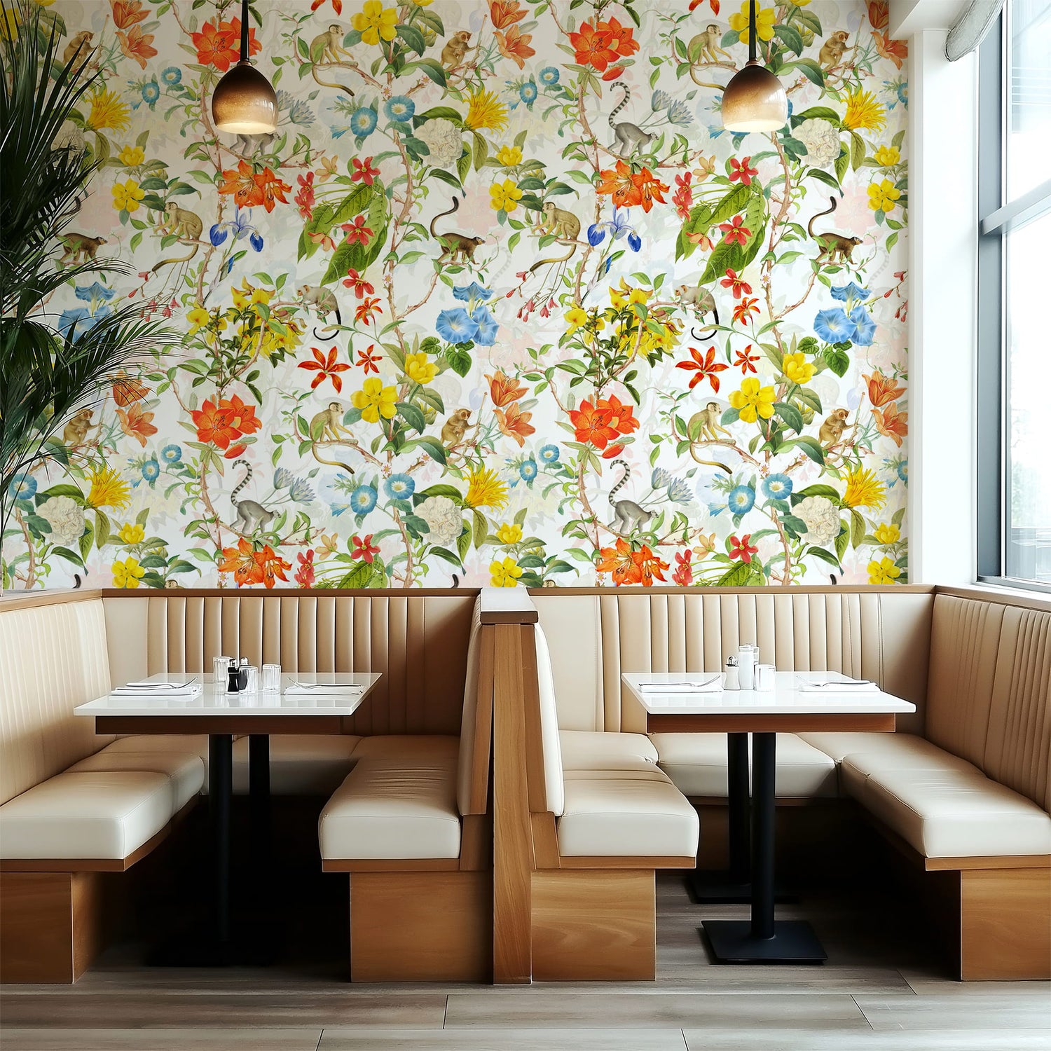 Bright Tropical Wallpaper – Monkeys & Botanical Floral Pattern