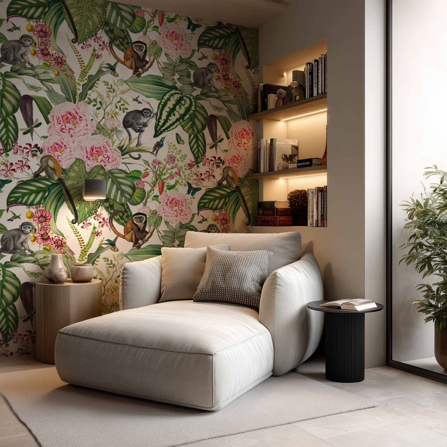 Jungle Paradise Wallpaper with Pink Flowers & Monkeys