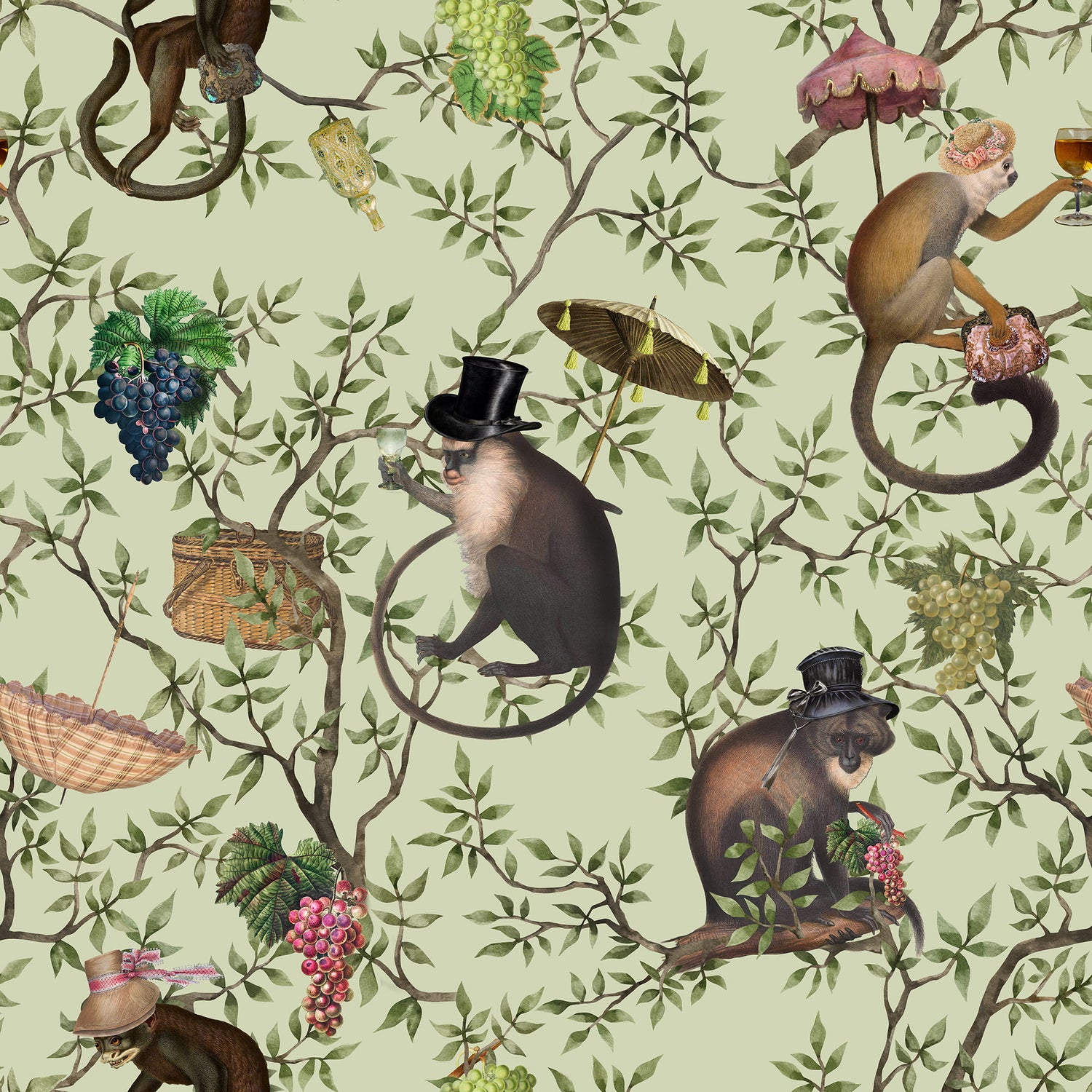 Sage Singerie Wallpaper – Monkey Garden Party Pattern