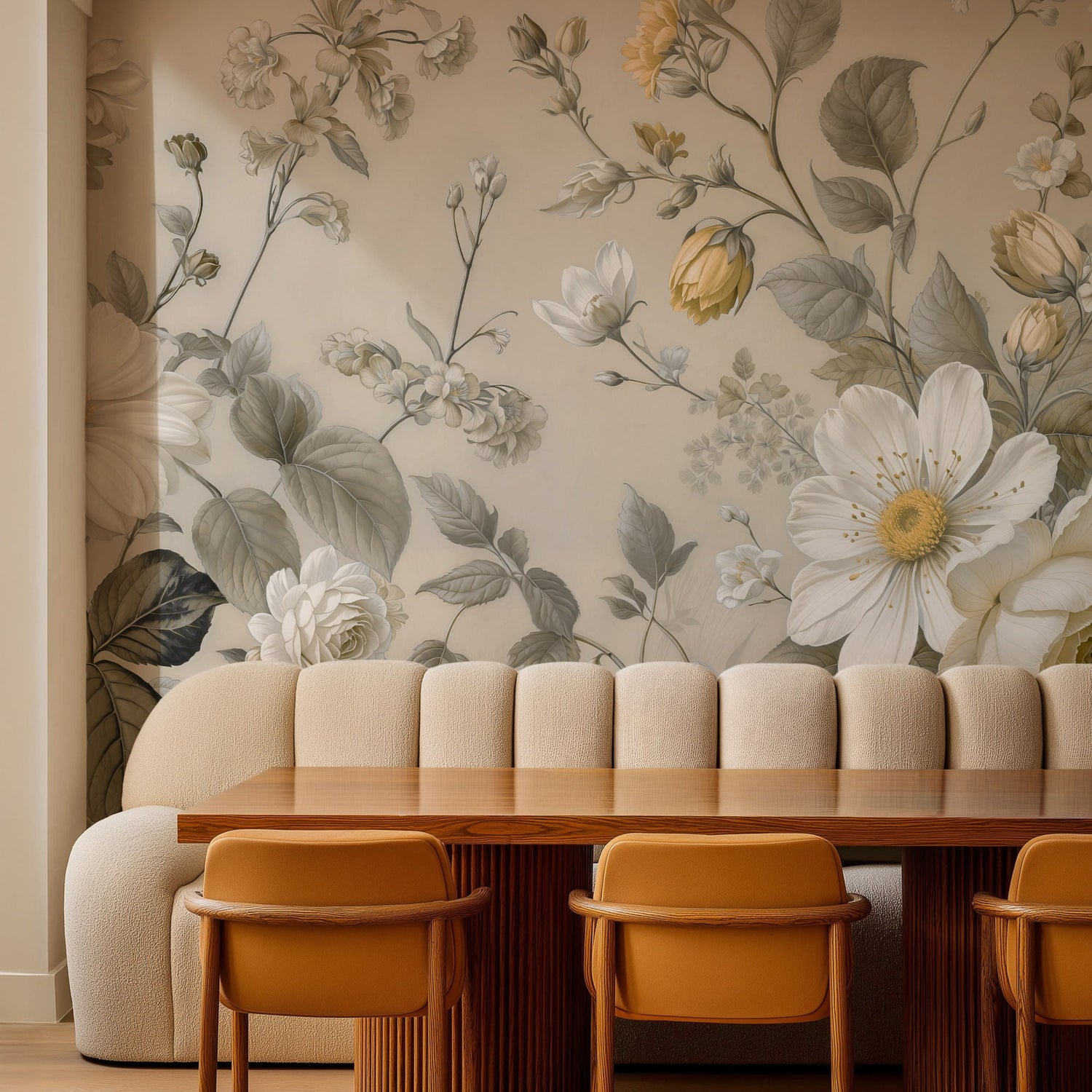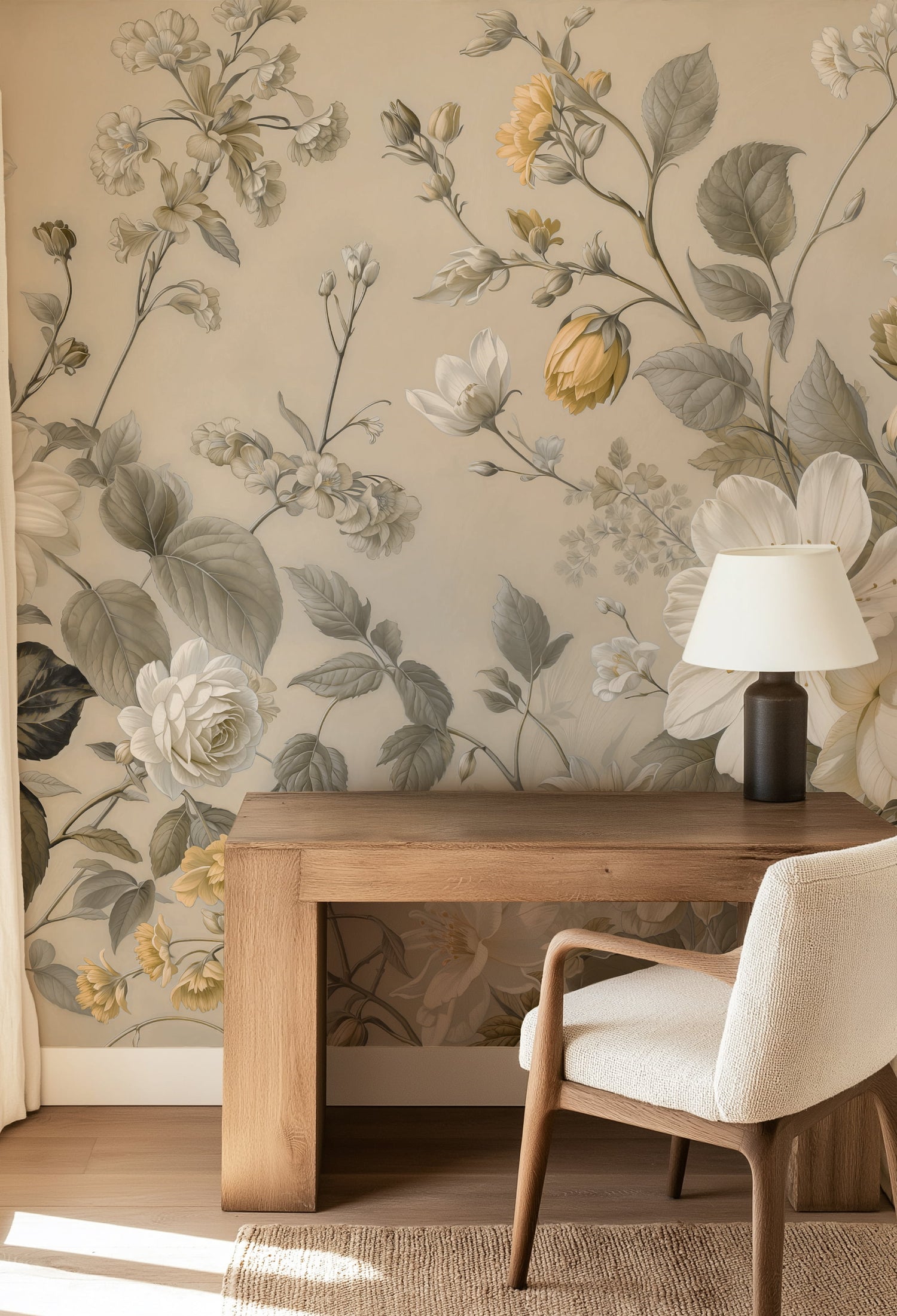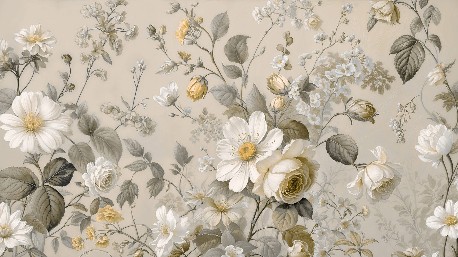 Small accents of ochre yellow in the rosebuds and flower centers add just enough warmth to keep the mural feeling alive without breaking the neutral color scheme. It is a design that whispers rather than shouts, bringing a sense of heritage and calm to any interior.