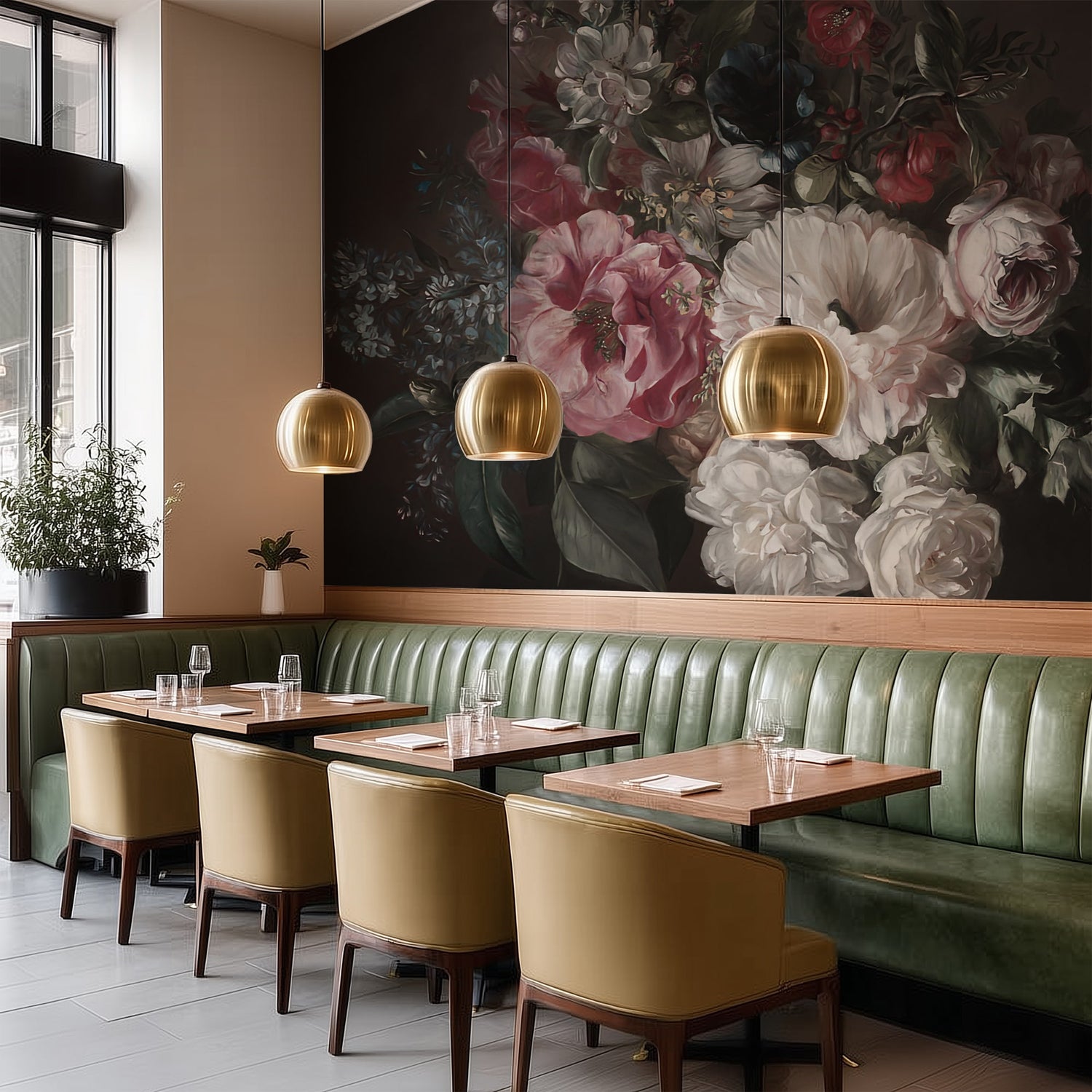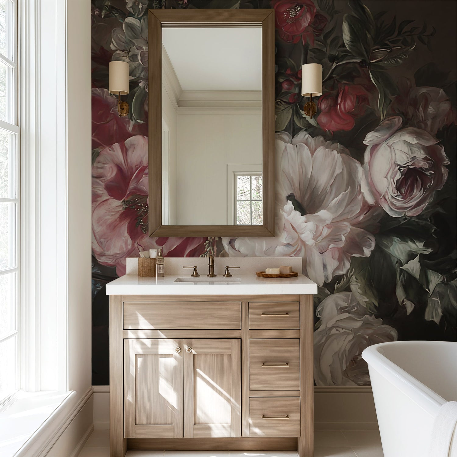 Drawing inspiration from the opulent still lifes of the 17th century, this mural features a rich, overflowing bouquet set against a moody, shadow-filled background. The composition is centered around a stunning blush-coral peony and voluptuous white garden roses, but the true star is the inclusion of delicate purple lilacs, which add a rare, fragrant softness to the dark aesthetic.