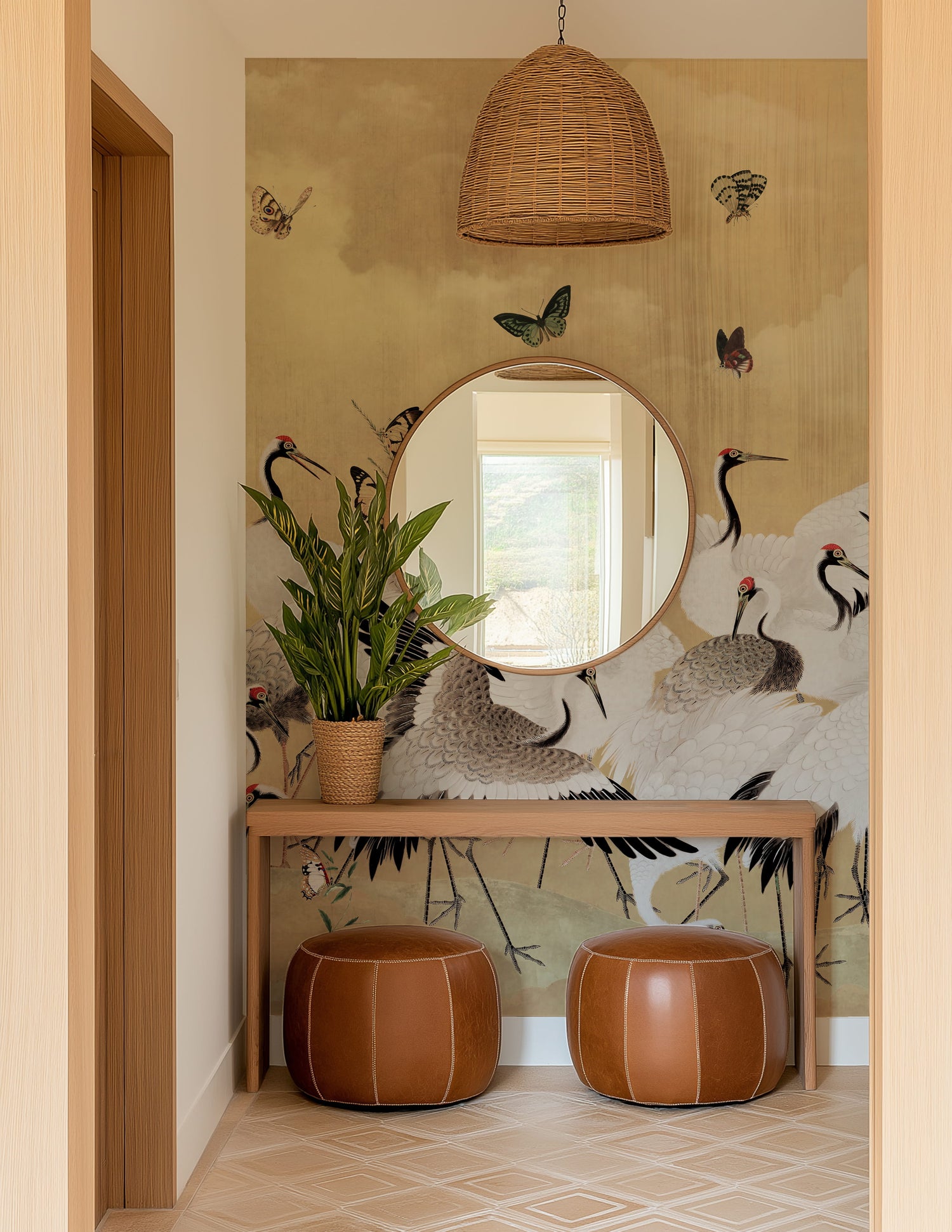 The large-scale Cranes form an exotic and monumental bird wallpaper that will create the most beautifully enthralling interior. Nothing says lux and glamour like this Japanese wallpaper - it transforms a flat wall into a shimmering, historical tapestry.