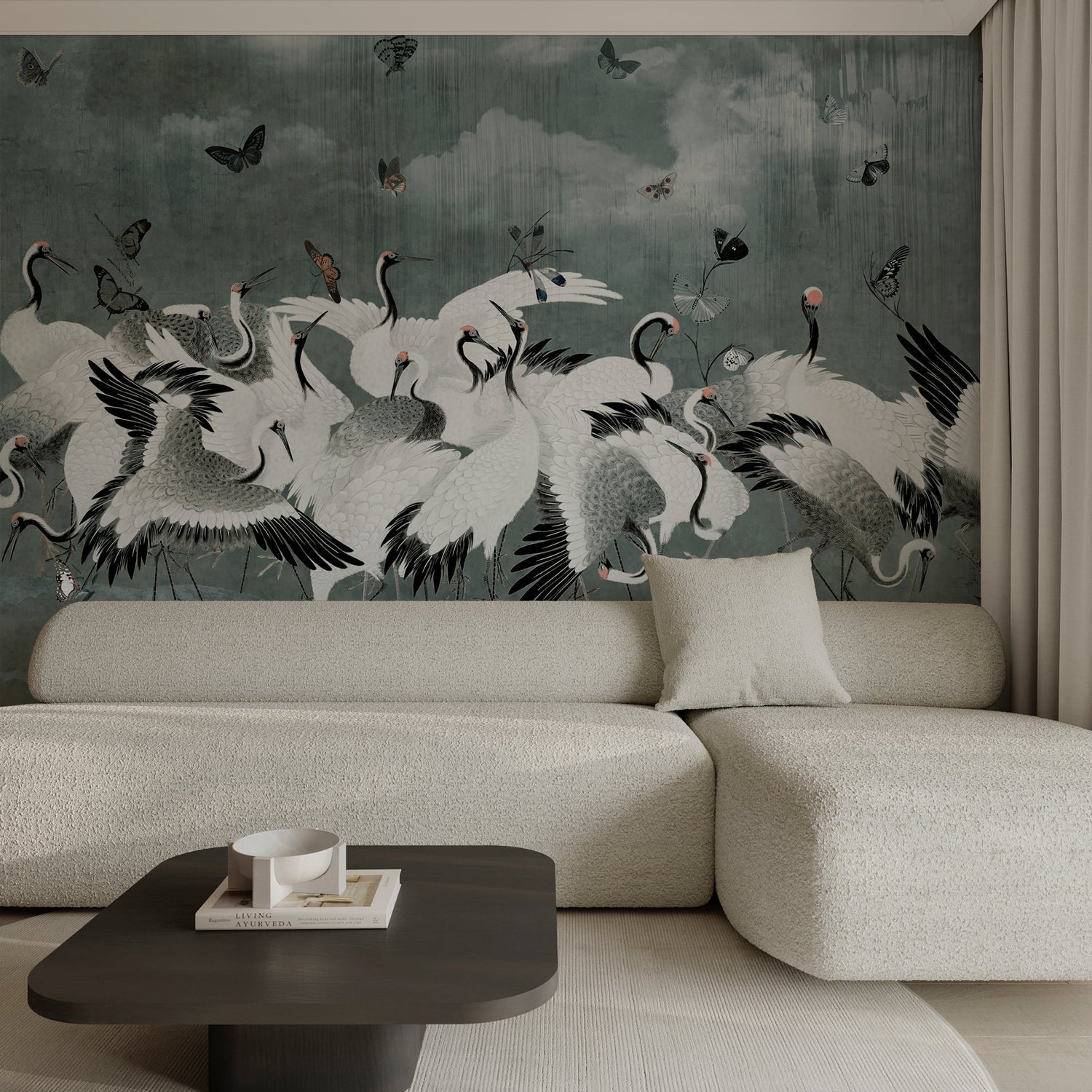 Capturing the ethereal beauty of a misty morning in the Edo period, the Livid Japanese Chinoiserie Cranes Wall Mural is a design of profound tranquility. Created by artist Marina Stupakova, this mural reimagines the monumental scale of traditional Byobu folding screens with a cool, contemporary palette that fits perfectly into modern Japandi and coastal interiors.