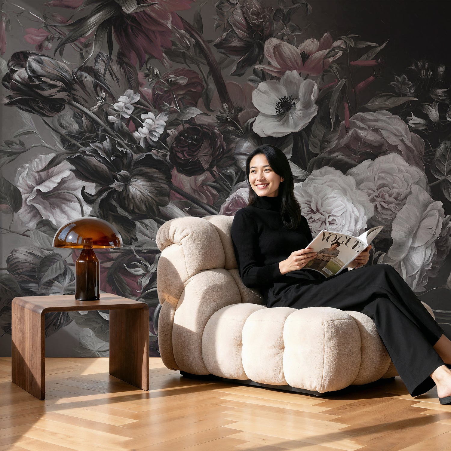 Drawing direct inspiration from the Dutch Golden Age, this design features a lavish, sprawling bouquet set against a deep charcoal and black background. The composition utilizes the classic technique of chiaroscuro (extreme contrast between light and dark) to illuminate the velvety petals of creamy garden roses, burgundy tulips, and white anemones with striking black centers. The visible brushstrokes and rich texture mimic the look of an authentic 17th-century oil painting, giving your walls the depth and gravity of a curated museum exhibit.
