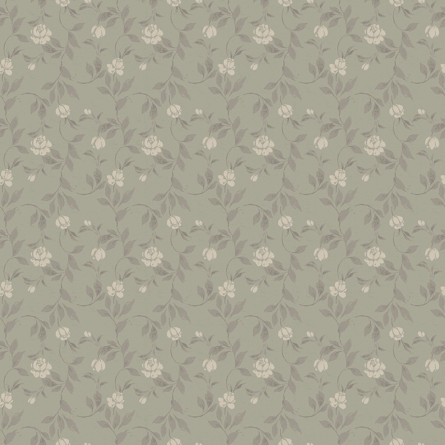 The muted green background is layered with subtle florals and foliage in warm neutral tones, making it easy to pair with light woods, painted furniture, linen textiles, and traditional or cottage-inspired decor. Ideal for bedrooms, living spaces, dining rooms, or refined accent walls, this design adds character without overwhelming the space.