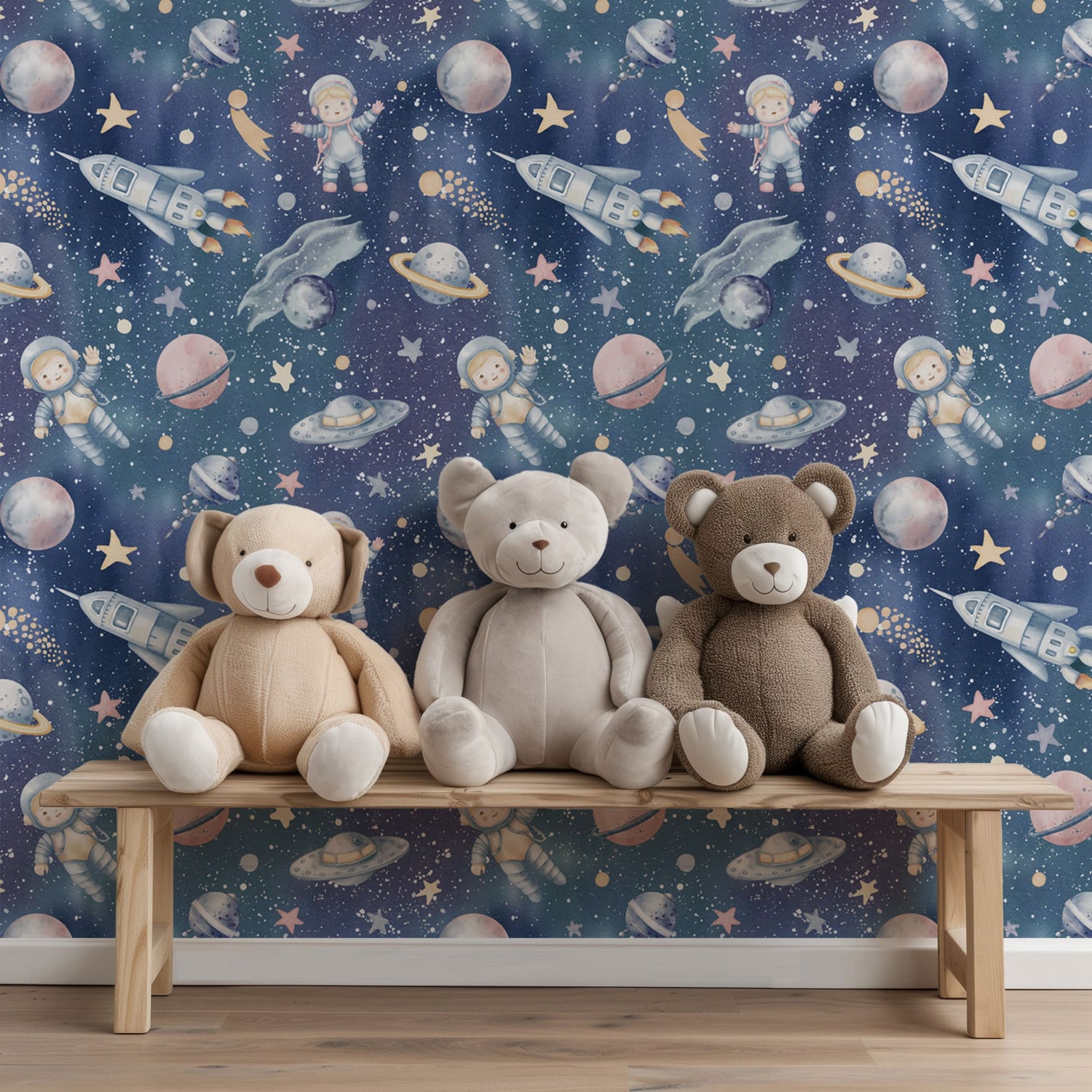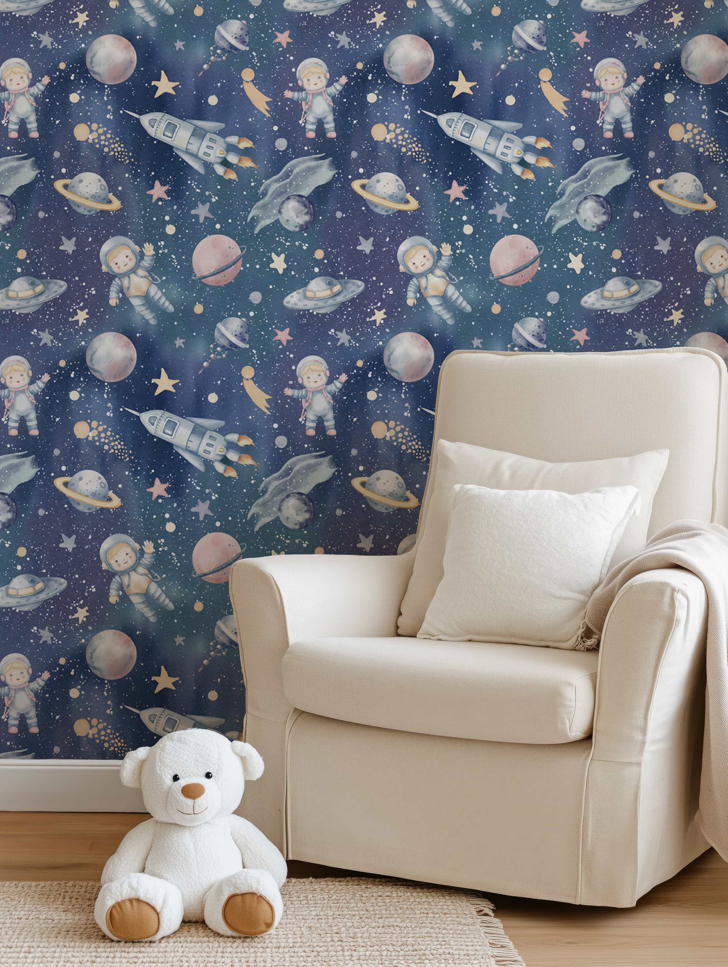 Launch into a universe of imagination with our Dreamy Cosmic Adventure Wallpaper. This unique design transforms any room into a captivating galaxy, featuring adorable astronauts, whimsical planets, soaring rockets, and twinkling stars, all rendered in exquisite watercolor artistry on a deep, enchanting blue backdrop.