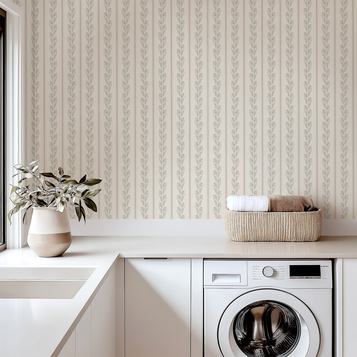 The design features delicate, vertical columns of climbing blush pink tulips rising gracefully against a warm cream background. Interspersed with fine pink pinstripes, these floral vines create a visual lift that makes ceilings appear higher and rooms feel airier. The gentle, dusty rose hues of the petals, paired with muted sage green stems, offer a timeless aesthetic that feels both heritage-inspired and freshly picked.