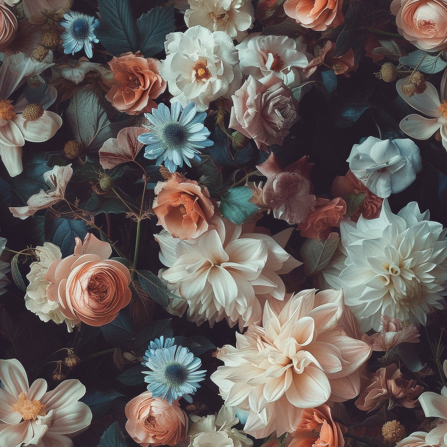 Transform your space with the dramatic elegance of our Moody Floral Wallpaper. This stunning design features a rich, dark background adorned with an intricate array of blooming flowers, including roses, dahlias, and anemones, in soft shades of peach, blue, and ivory.