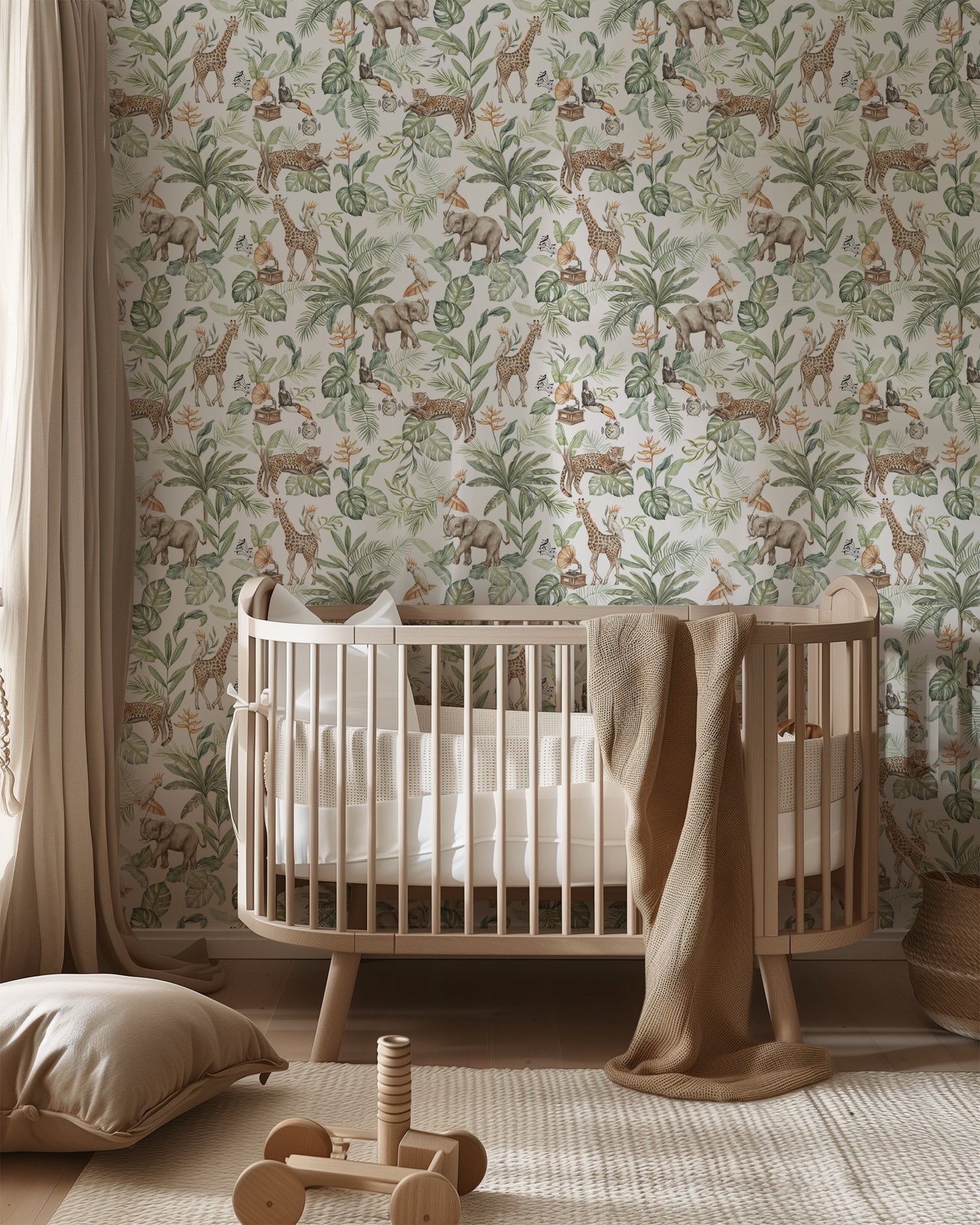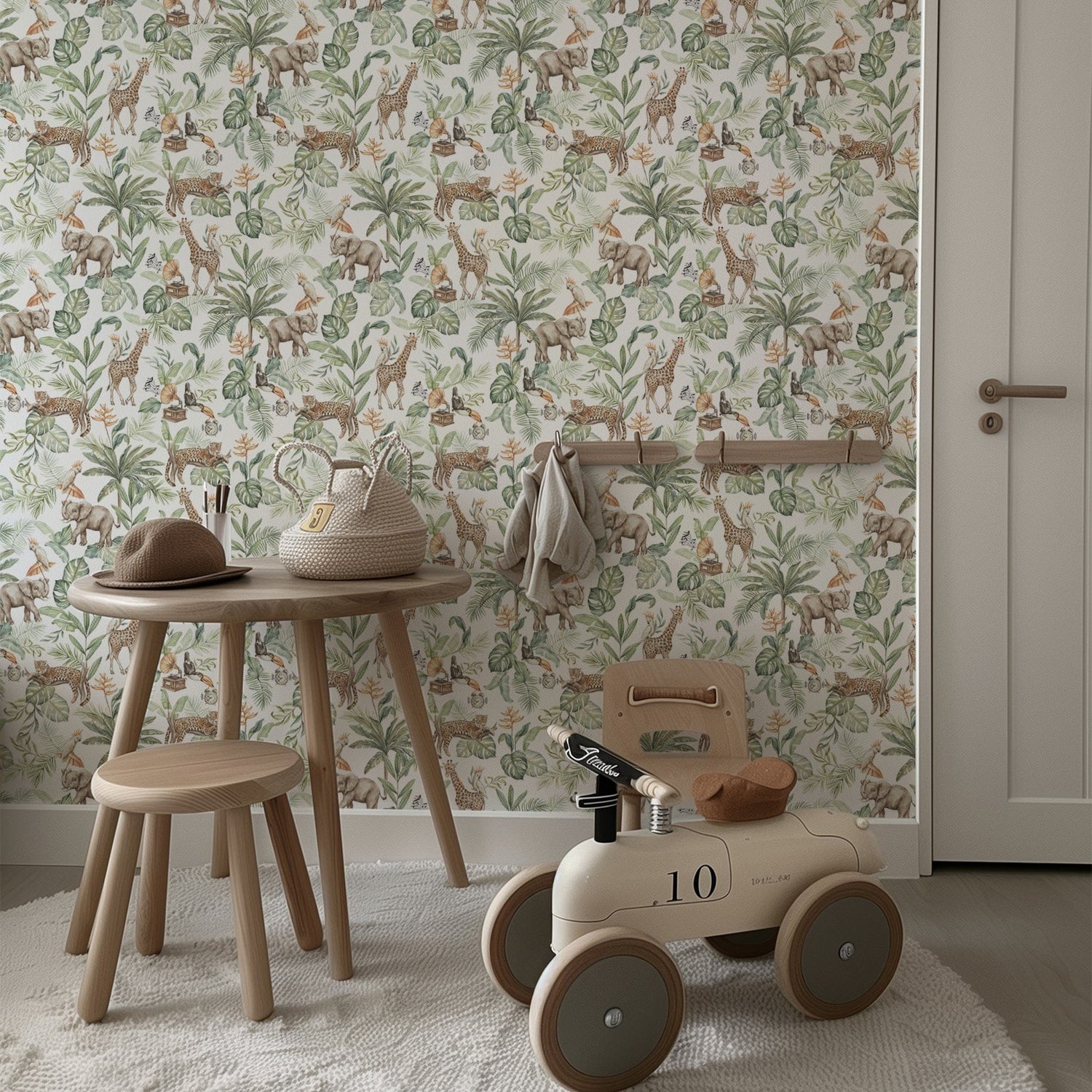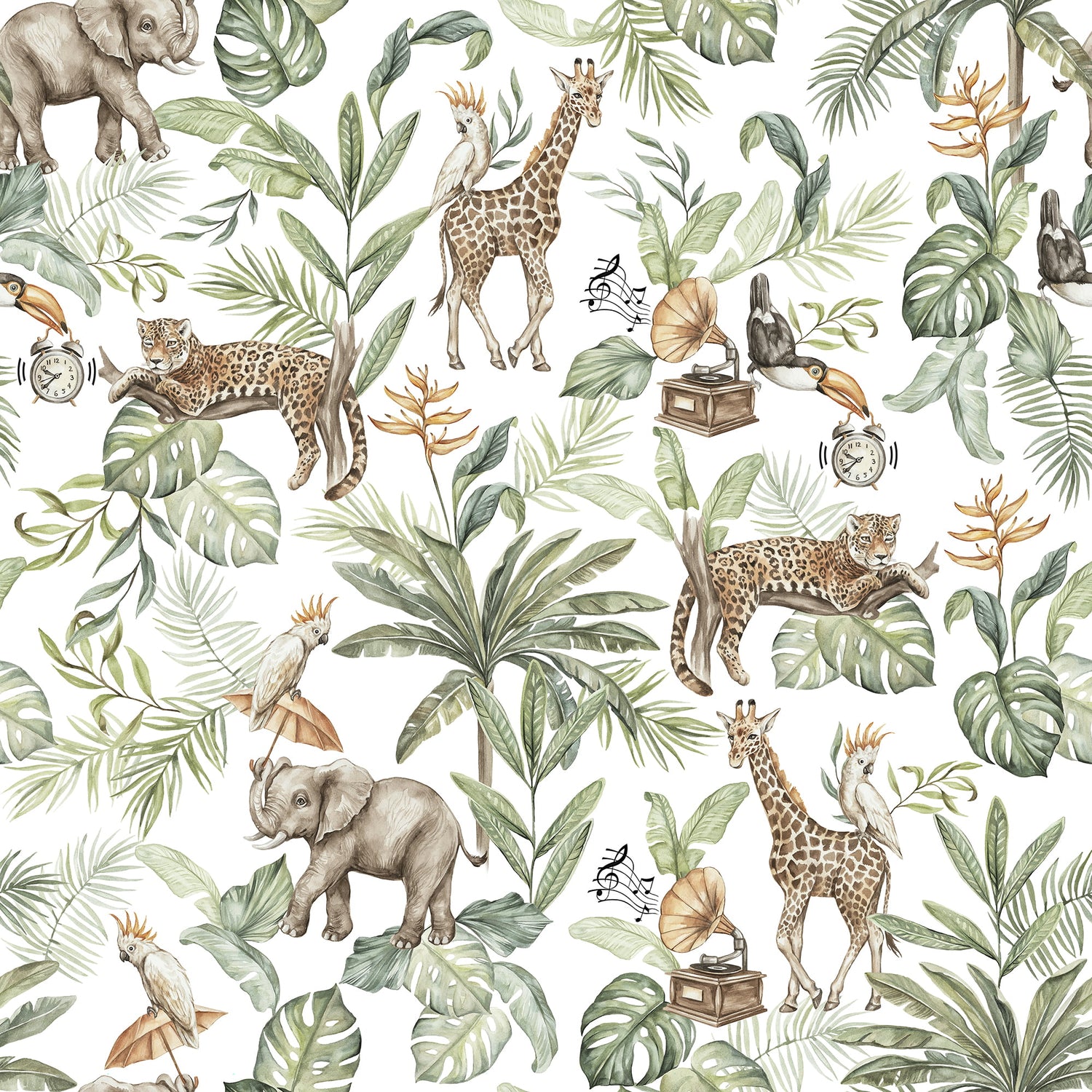 Transform your space into a vibrant safari adventure with this stunning wallpaper design. Featuring hand-painted giraffes, elephants, leopards, toucans, and exotic cockatoos set against lush tropical foliage, this pattern brings the energy of the wild into any room. Delicate gramophones and vintage accents add a playful, unexpected twist—perfect for sparking curiosity and conversation.