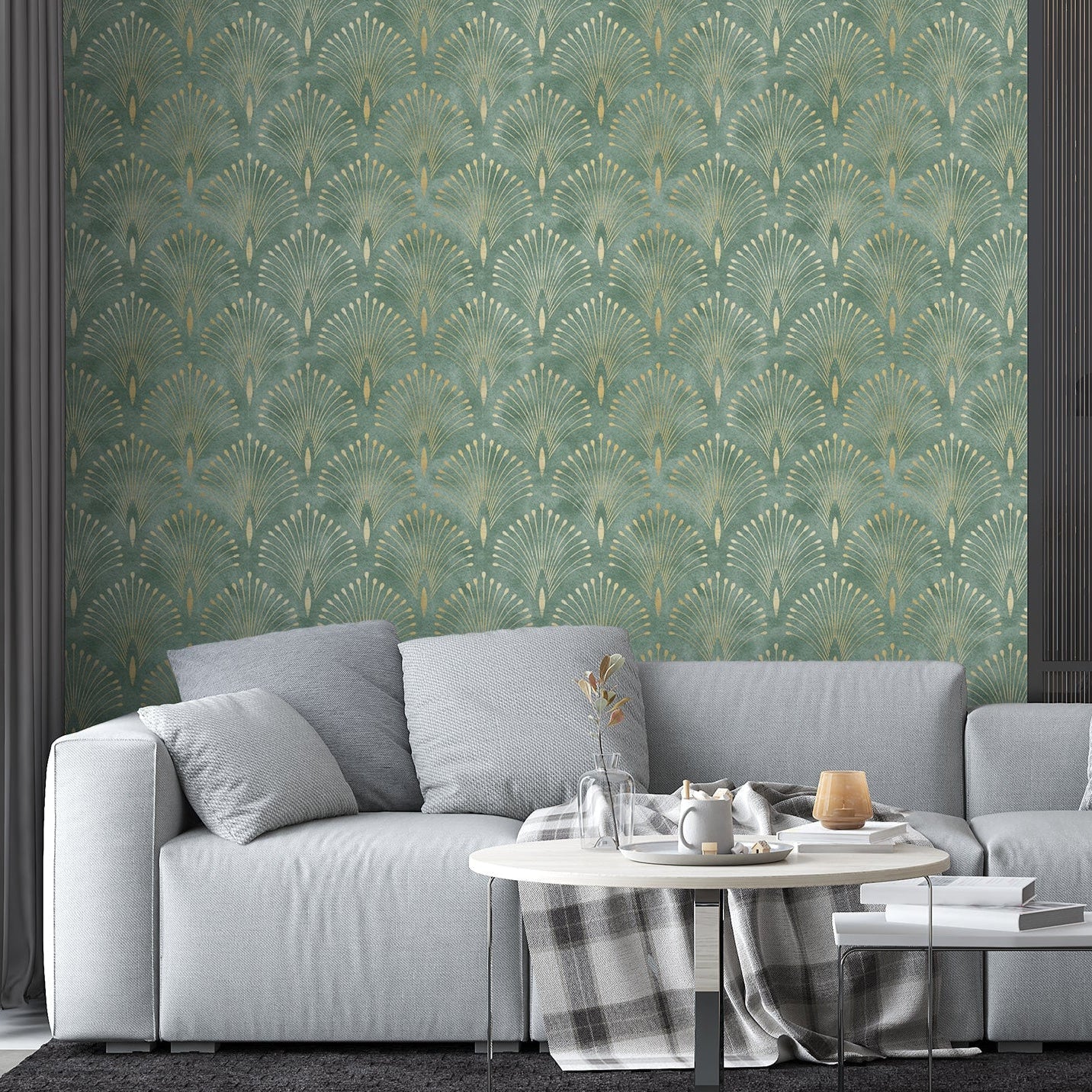 Art Deco Green and Gold Wallpaper - Sample: 12"W x 10"H / Smooth Vinyl Peel & Stick is backordered and will ship as soon as it is back in stock.