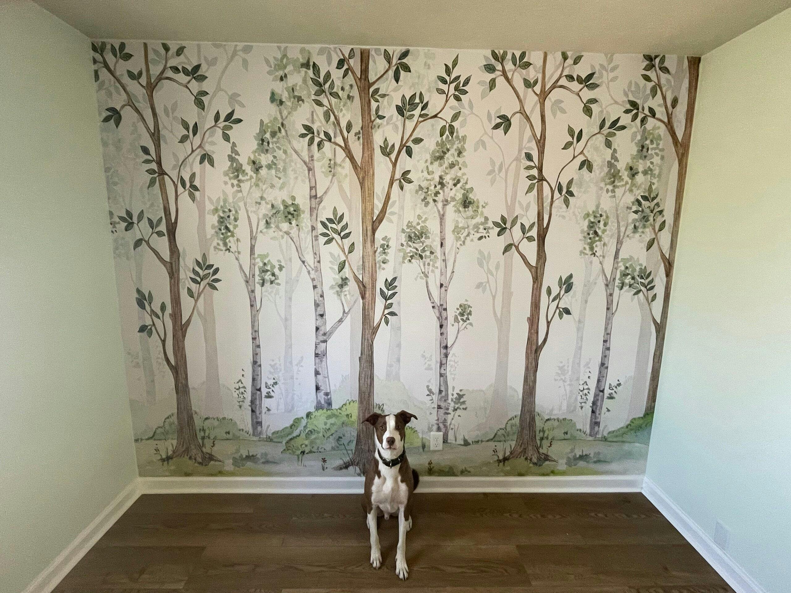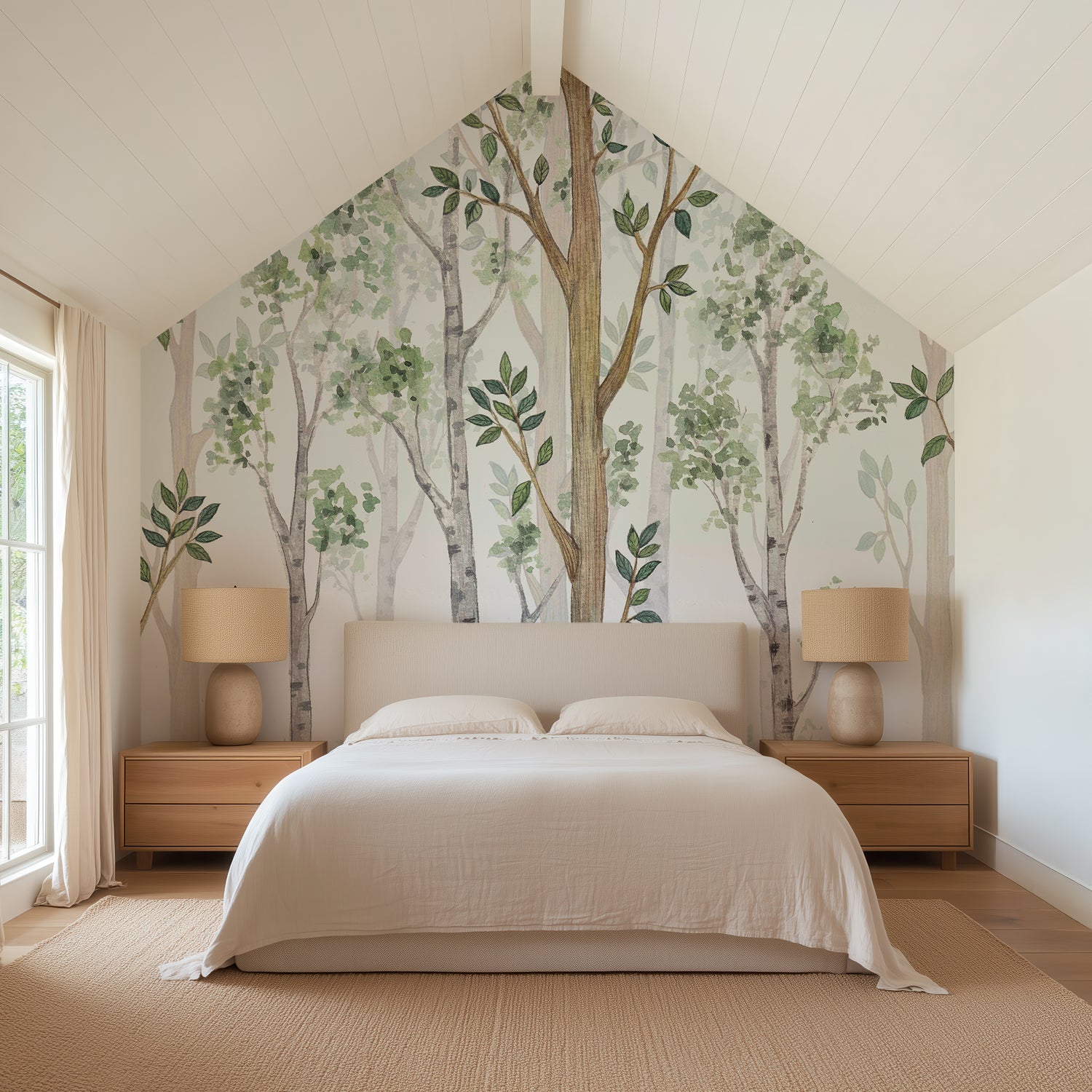 Elevate your space with our Birch Forest Watercolor Wallpaper. Each piece is hand drawn, creating a unique and stunning effect. Simply peel and stick for an effortless transformation. Add a touch of nature and charm to any room instantly. Make your purchase today and bring the serene beauty of a birch forest into your home.