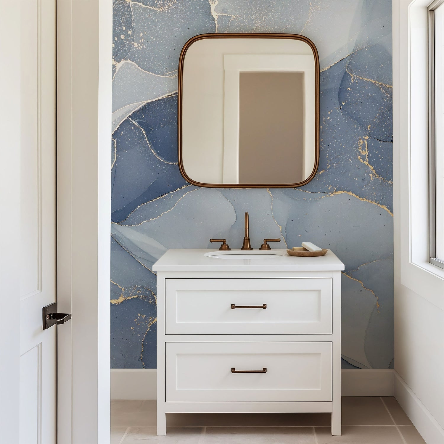 The rich blend of navy, slate blue, and smoky gray harmonizes with subtle gold detailing, making it a perfect match for brass fixtures, marble counters, white cabinetry, and spa-inspired décor. Whether used as a feature wall or full-room installation, this mural delivers a calming yet dramatic visual effect.