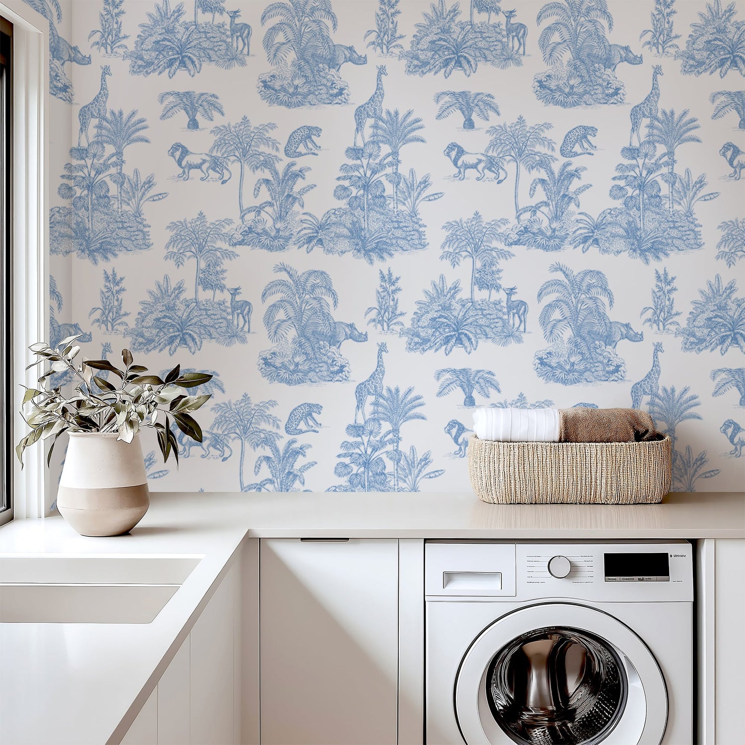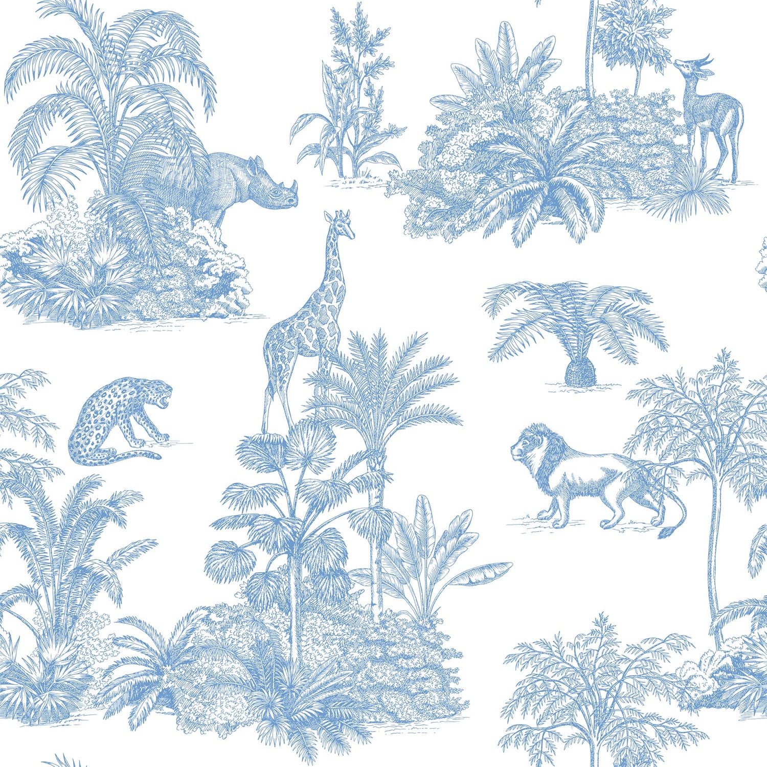 Blue Safari Toile Wallpaper - Jungle Animals in Classic Style - Sample: 12"W x 10"H / Smooth Vinyl Peel & Stick is backordered and will ship as soon as it is back in stock.