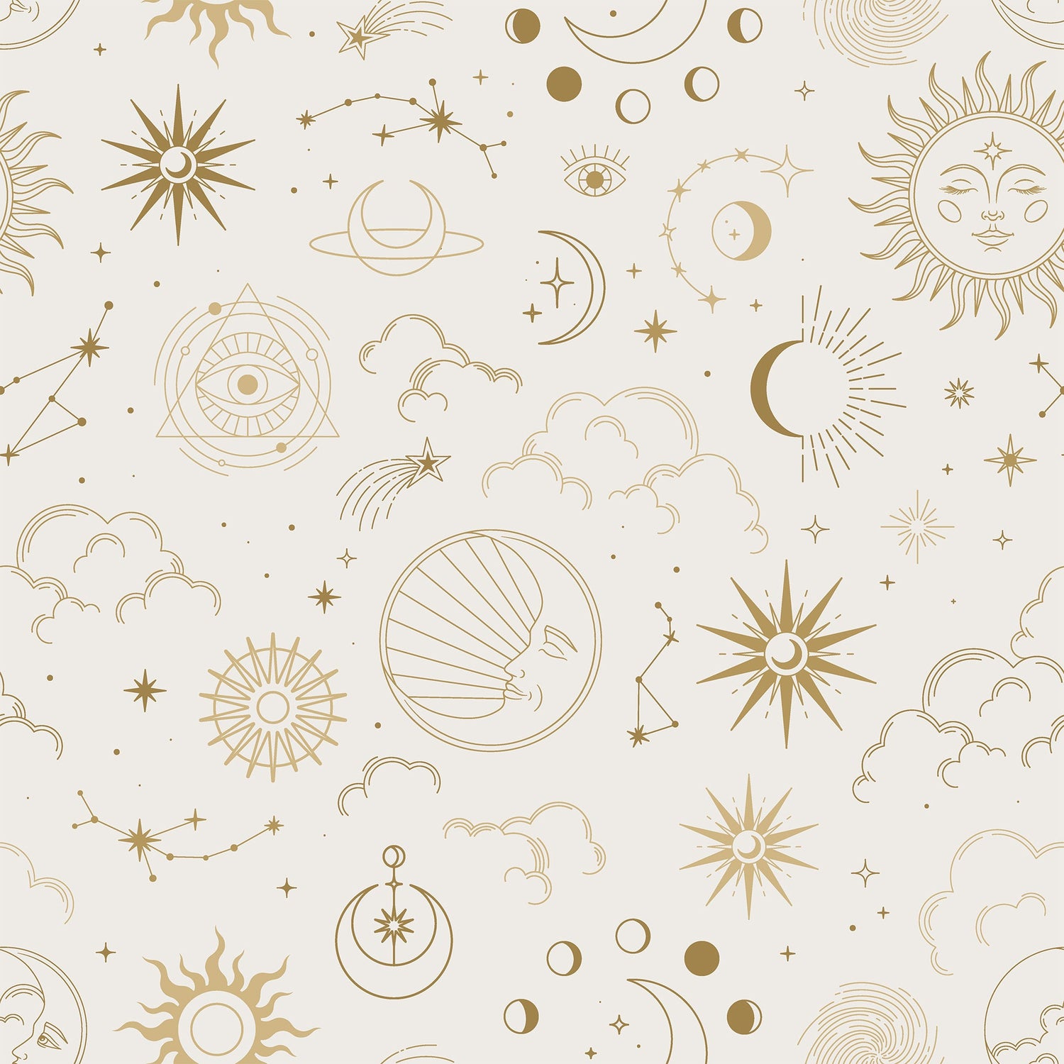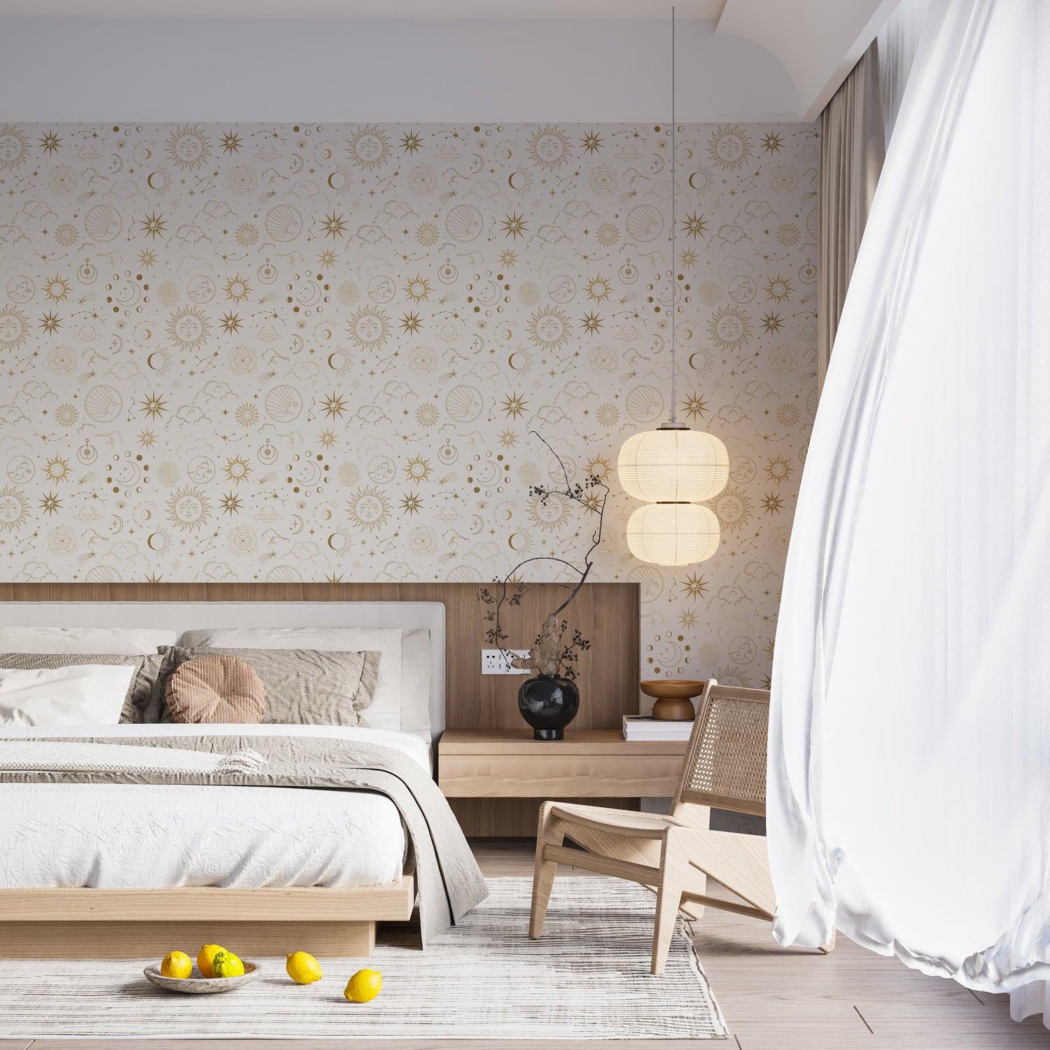 Transform your space with this celestial sun and moon wallpaper, featuring an enchanting astrology-inspired pattern with golden suns, crescent moons, constellations, and cosmic symbols. Designed for those who love boho, mystical, and spiritual interiors, this wallpaper brings a dreamy, ethereal energy to any room.