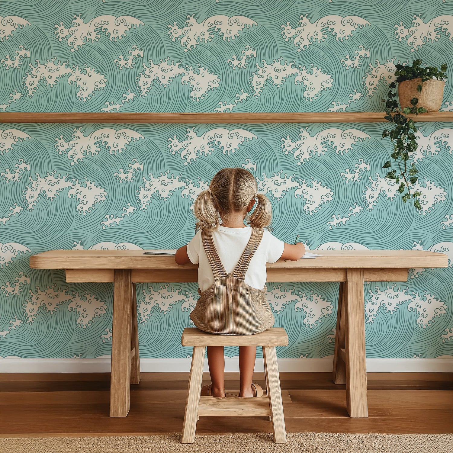Perfect for a variety of spaces, this wave wallpaper works beautifully in living rooms, bedrooms, nurseries, dining rooms, and offices. Commercial applications such as hotels, restaurants, and showrooms can also benefit from its dynamic yet soothing aesthetic, setting the tone for a welcoming and stylish atmosphere. Whether used as a feature wall, full-room covering, or large-scale commercial installation, this design brings the tranquility of the ocean indoors.