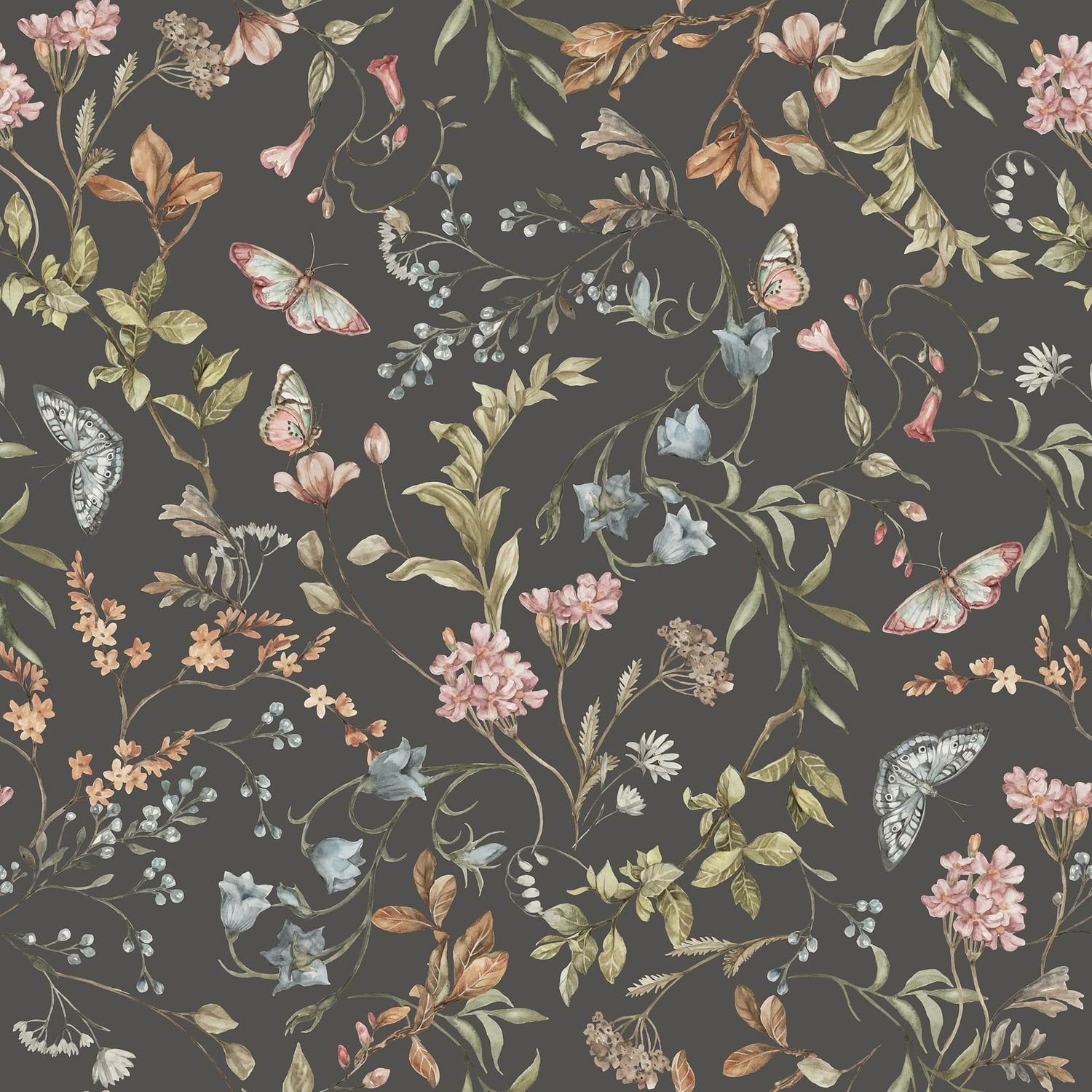 Cottage Meadow Noir – Moody Floral Wallpaper with Butterflies - Sample: 12''W x 10''H / Smooth Vinyl Peel & Stick is backordered and will ship as soon as it is back in stock.
