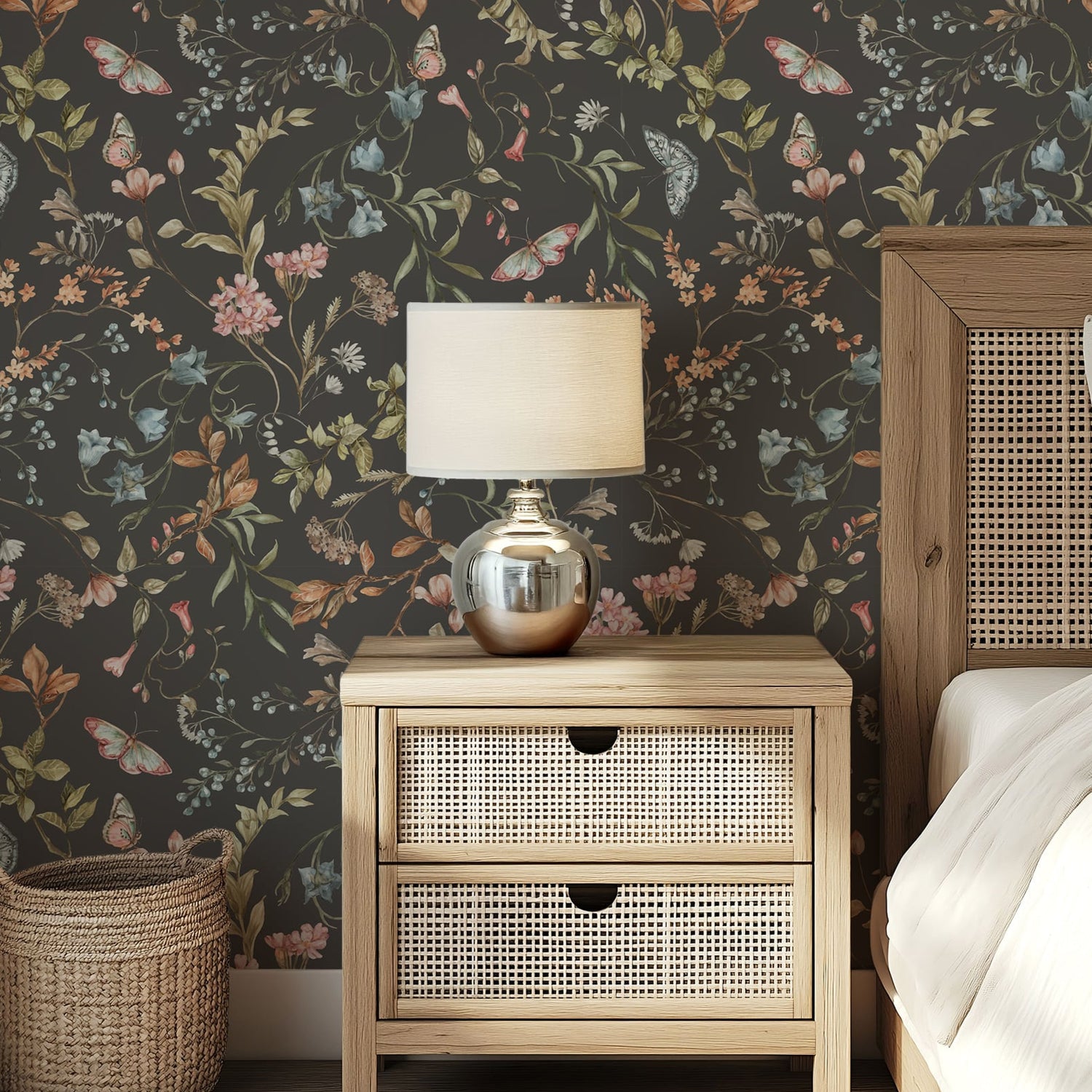 Cottage Meadow Noir – Moody Floral Wallpaper with Butterflies