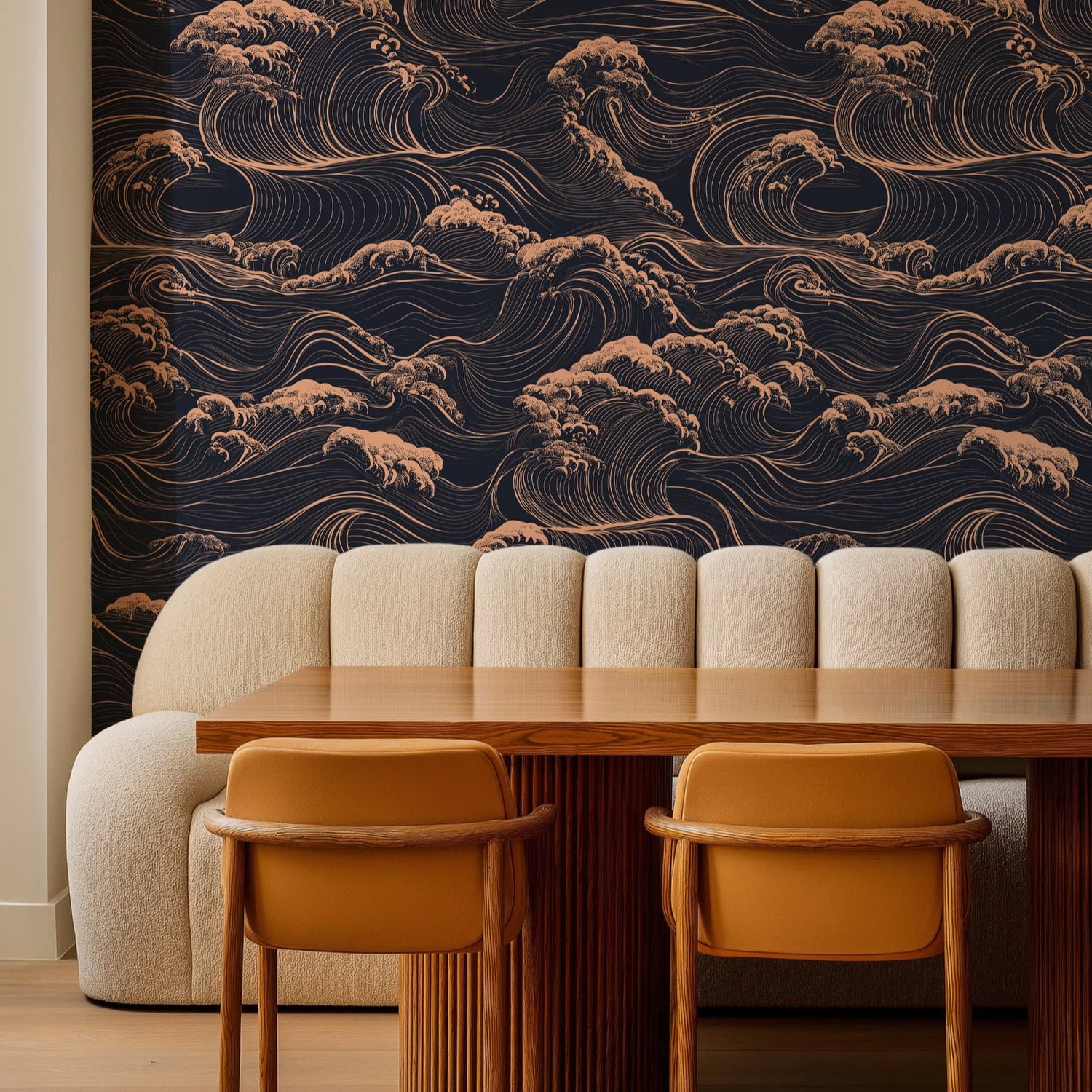 Dark gold ocean wave wallpaper captures the beauty and motion of the sea in an elegant, artistic form. Flowing gold lines create a rhythmic wave pattern over a deep black background, adding depth, sophistication, and visual movement to any space. The design balances modern minimalism with luxurious detail, making it ideal for statement walls in living rooms, offices, hotels, or commercial interiors.