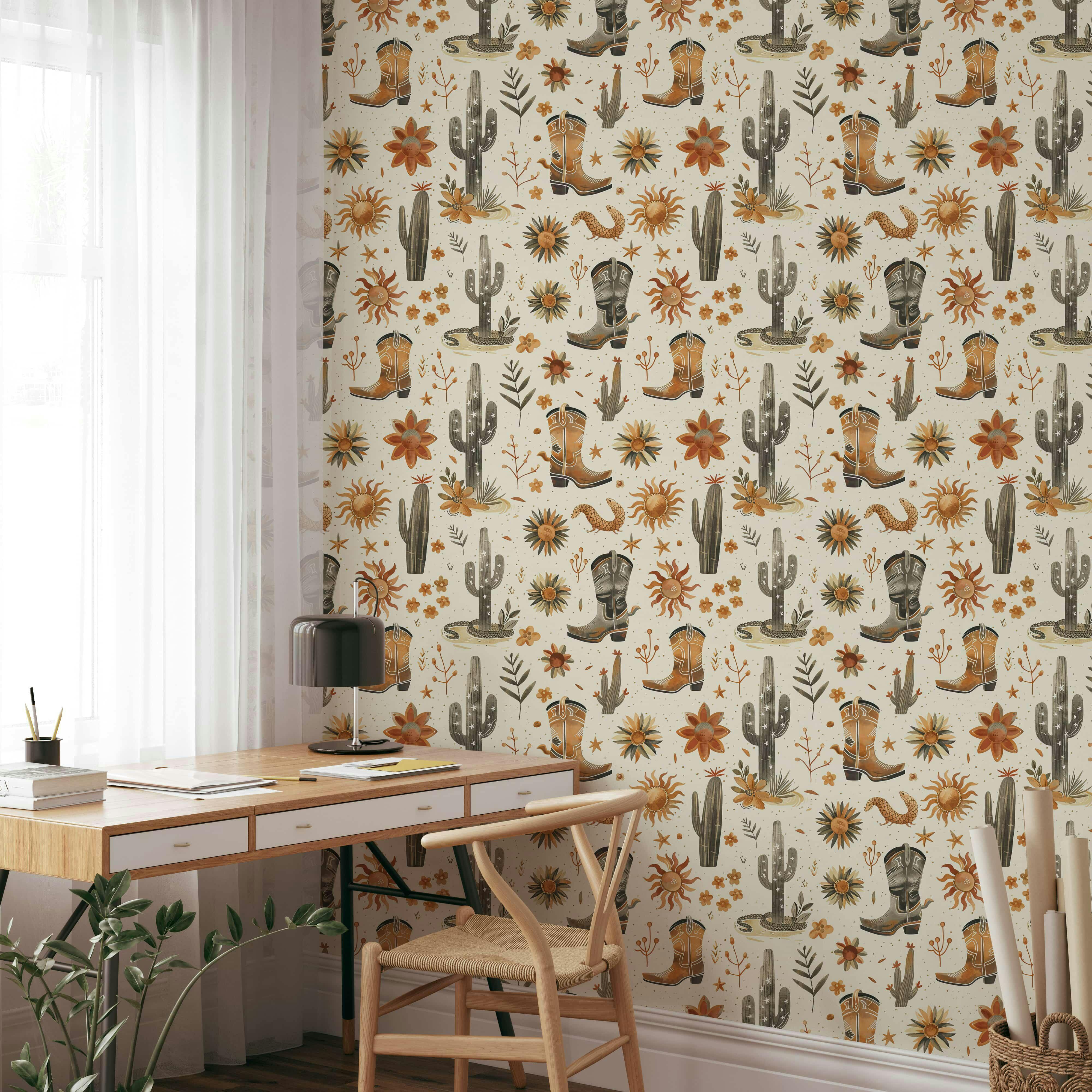 This vibrant design features an array of desert elements including cacti, cowboy boots, sun motifs, and blooming wildflowers in warm shades of orange, brown, and beige. Perfect for creating a cozy and rustic atmosphere, this wallpaper is ideal for living rooms, bedrooms, or any space that needs a unique and playful touch.