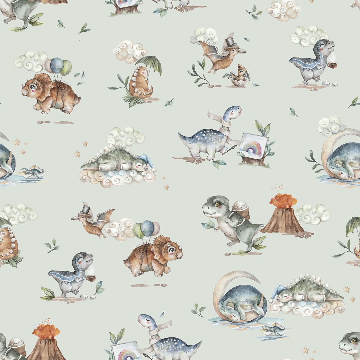Dino Era Serenity is an exclusive dinosaur wallpaper illustrated in dreamy watercolor tones. On a soft sage green background, sweet prehistoric friends explore, nap, paint rainbows, and drift on clouds - each detail crafted with warmth and whimsy.
