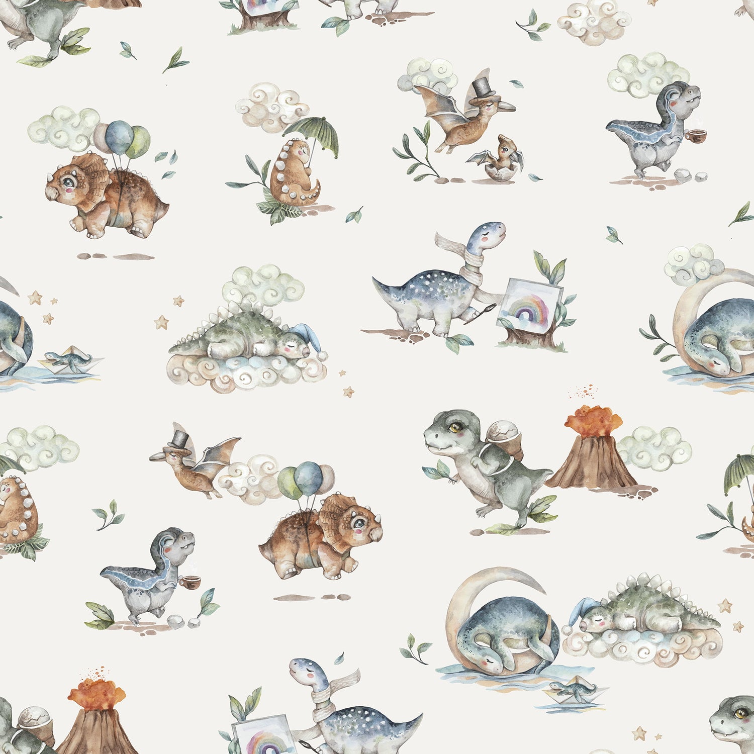 Gentle Dino Days is a heartwarming dinosaur wallpaper that blends soft watercolor charm with childhood imagination. On a soothing crème background, friendly dinos float on clouds, sip cocoa, paint rainbows, and drift into dreamy naps, making this design ideal for nurseries, toddler bedrooms, pediatric offices, or luxury play spaces.