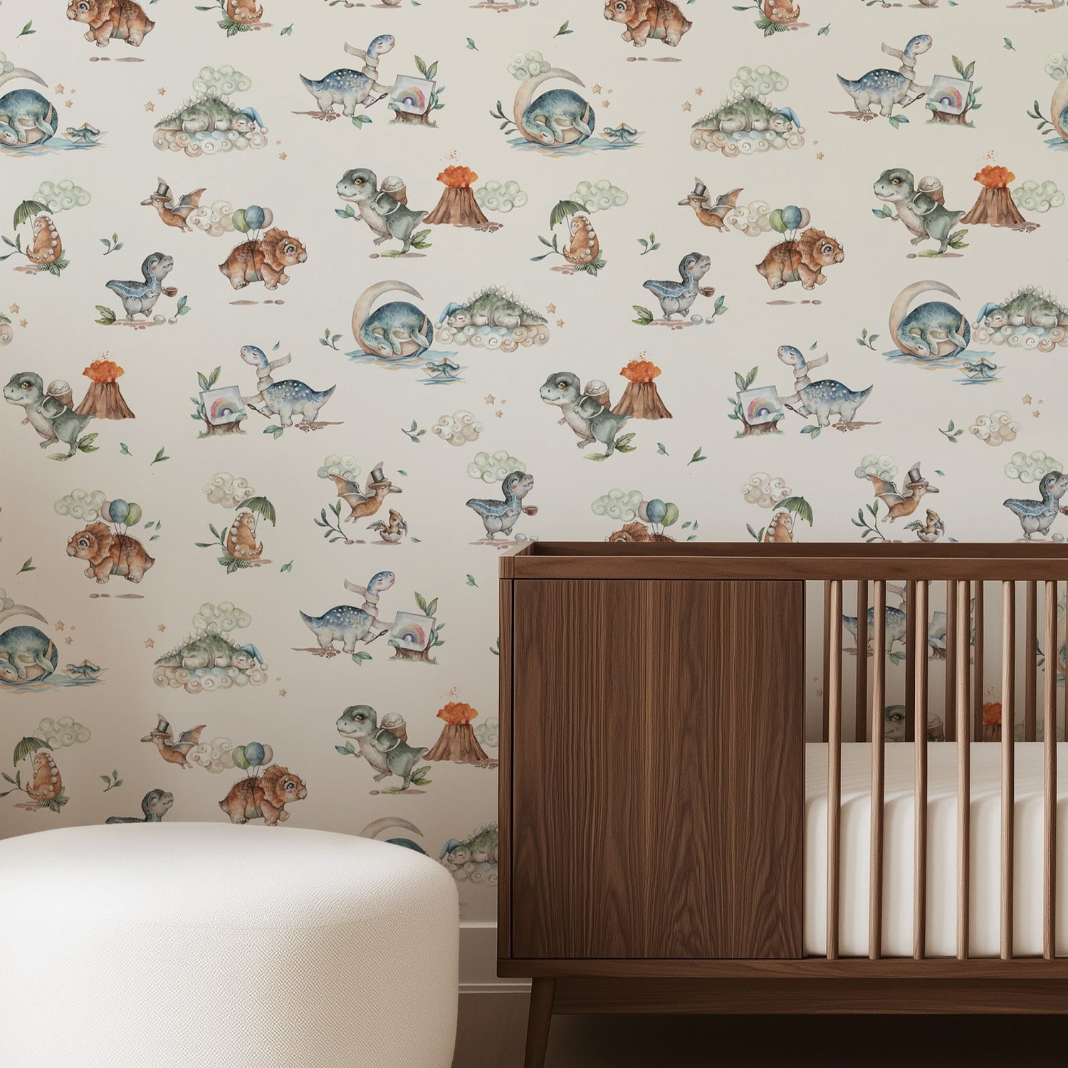 Every detail is hand-illustrated with care: from top-hat-wearing pterodactyls to balloon-carrying triceratops, the characters feel alive, gentle, and irresistibly lovable. This wallpaper transforms a room into a story, creating a nurturing space where calm and creativity coexist.