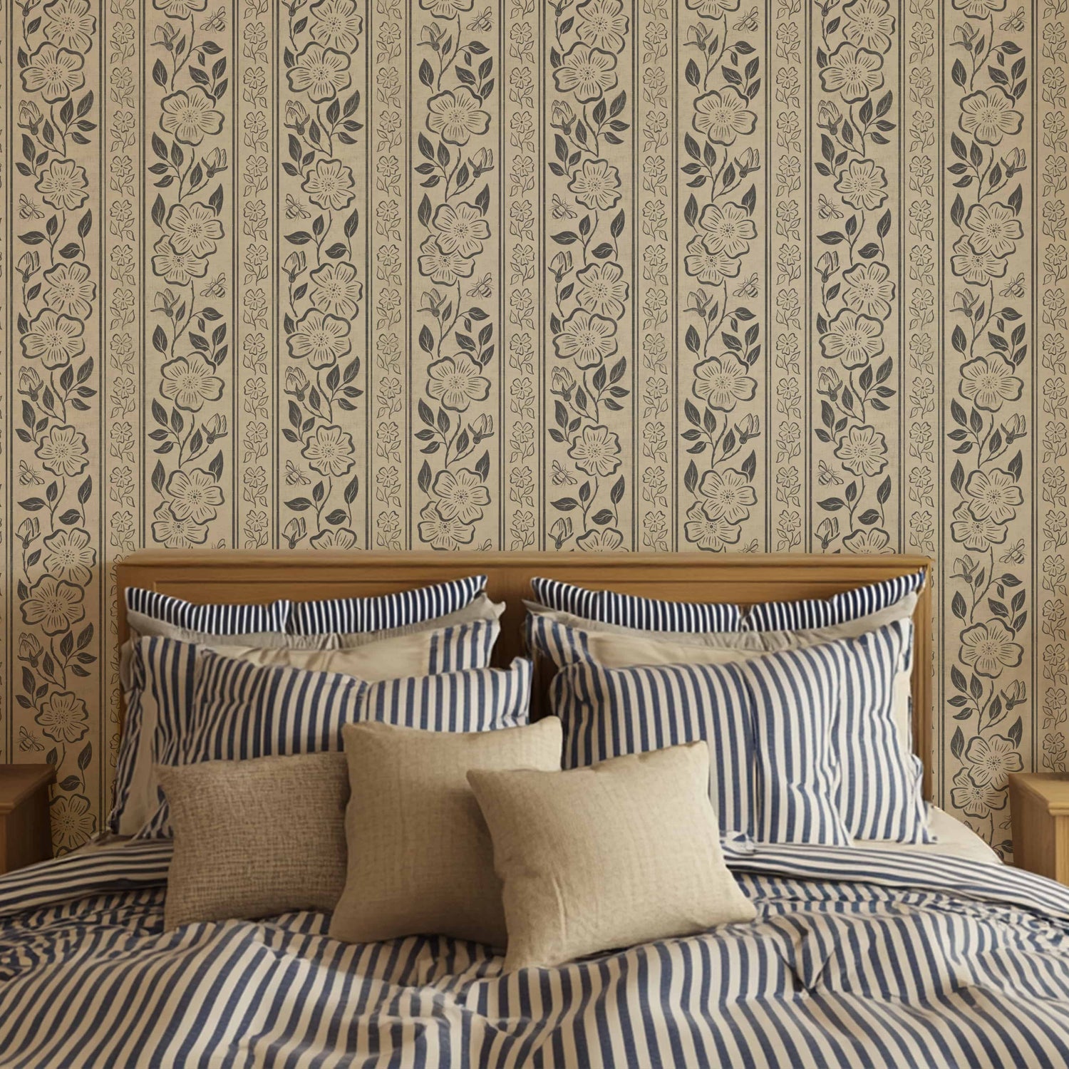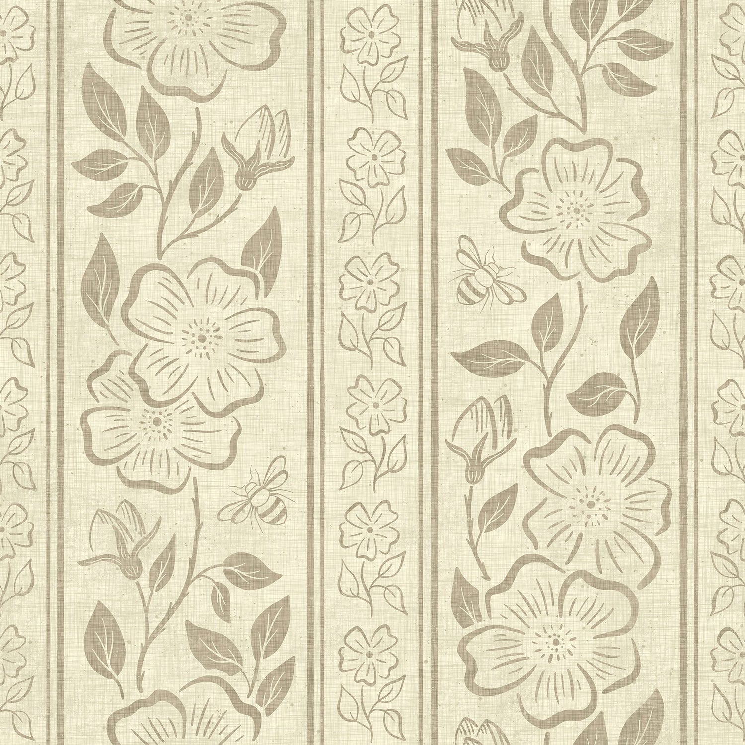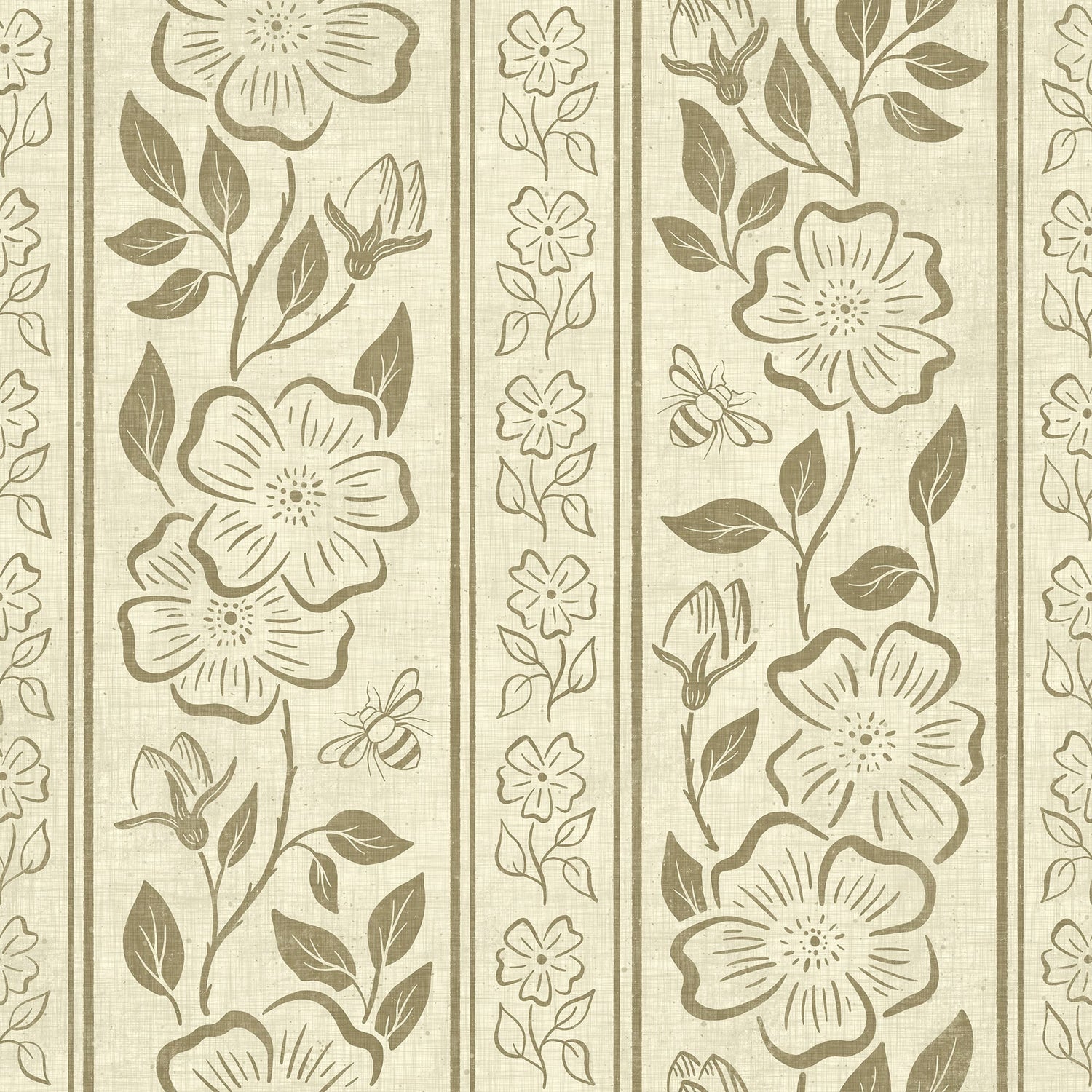 Linen Floral Stripe is a timeless vertical wallpaper featuring hand drawn botanicals, folk-style florals, and delicate bees - arranged in an alternating stripe pattern inspired by vintage textiles and artisan craft.