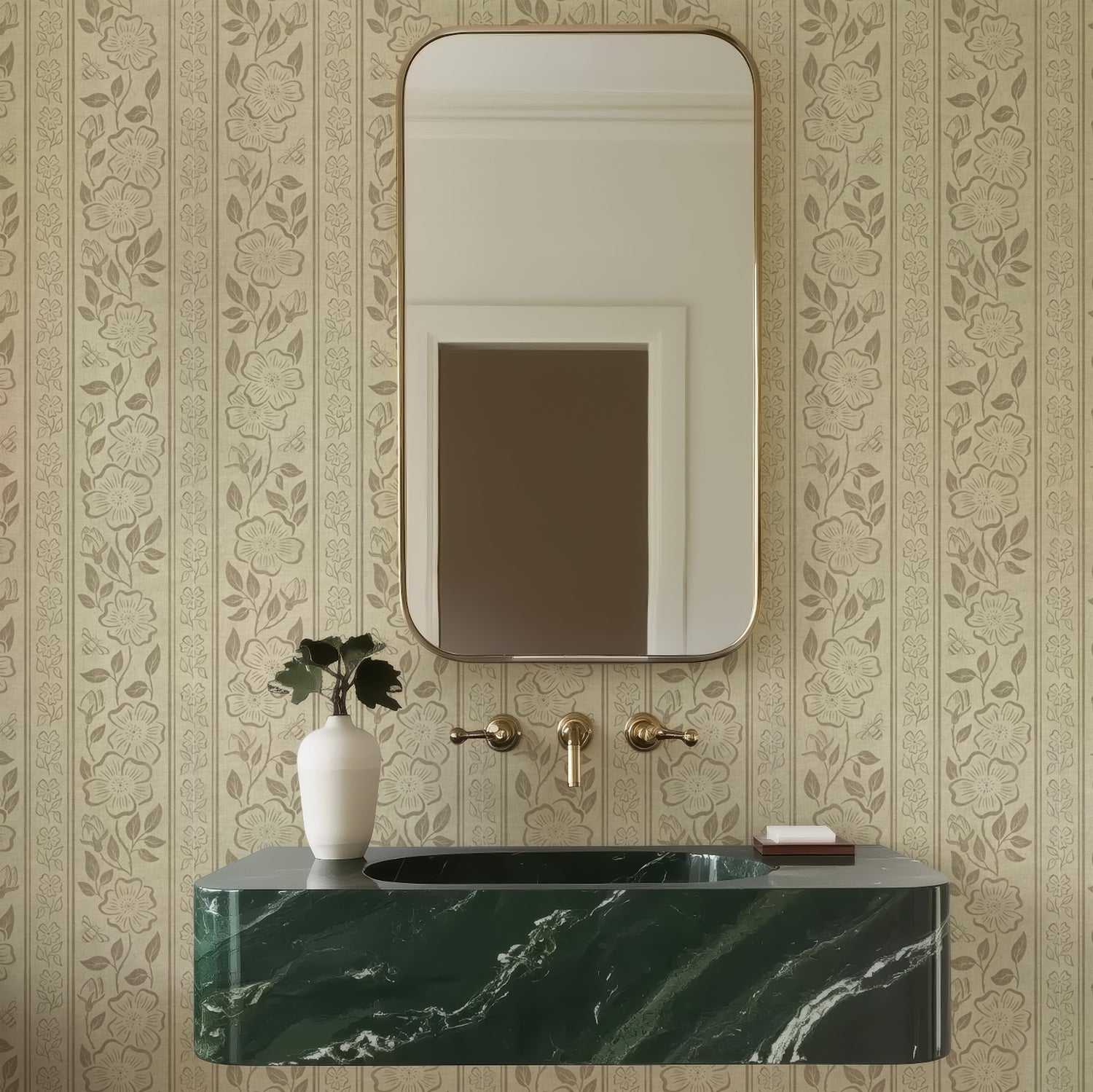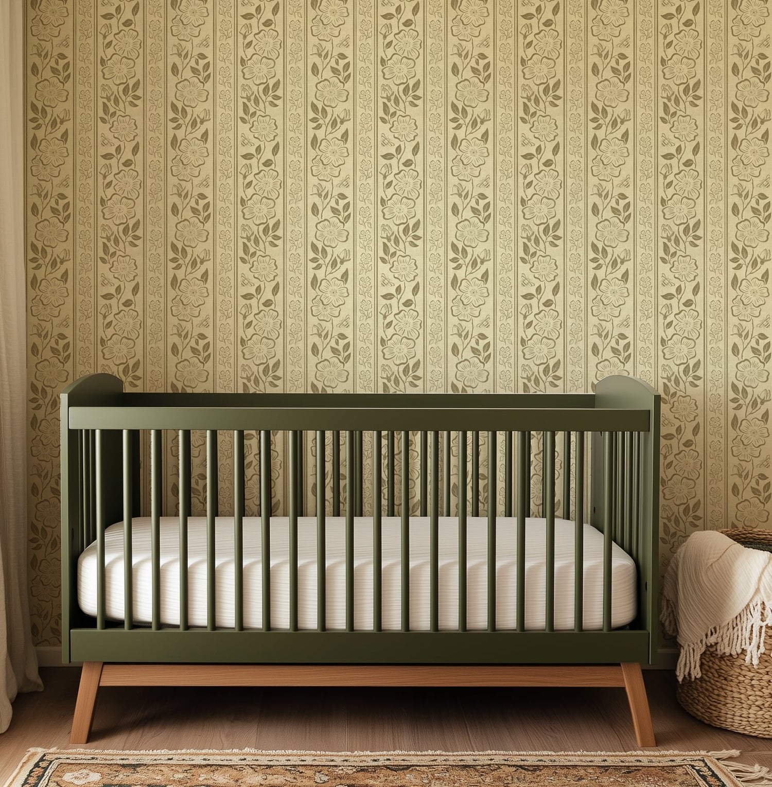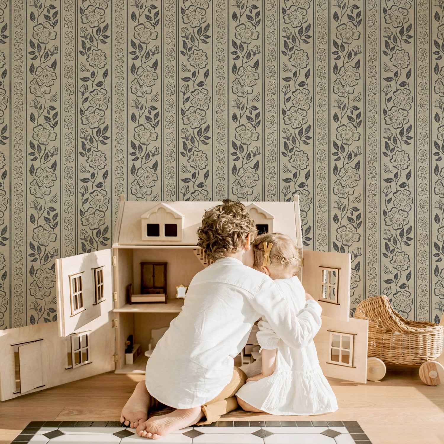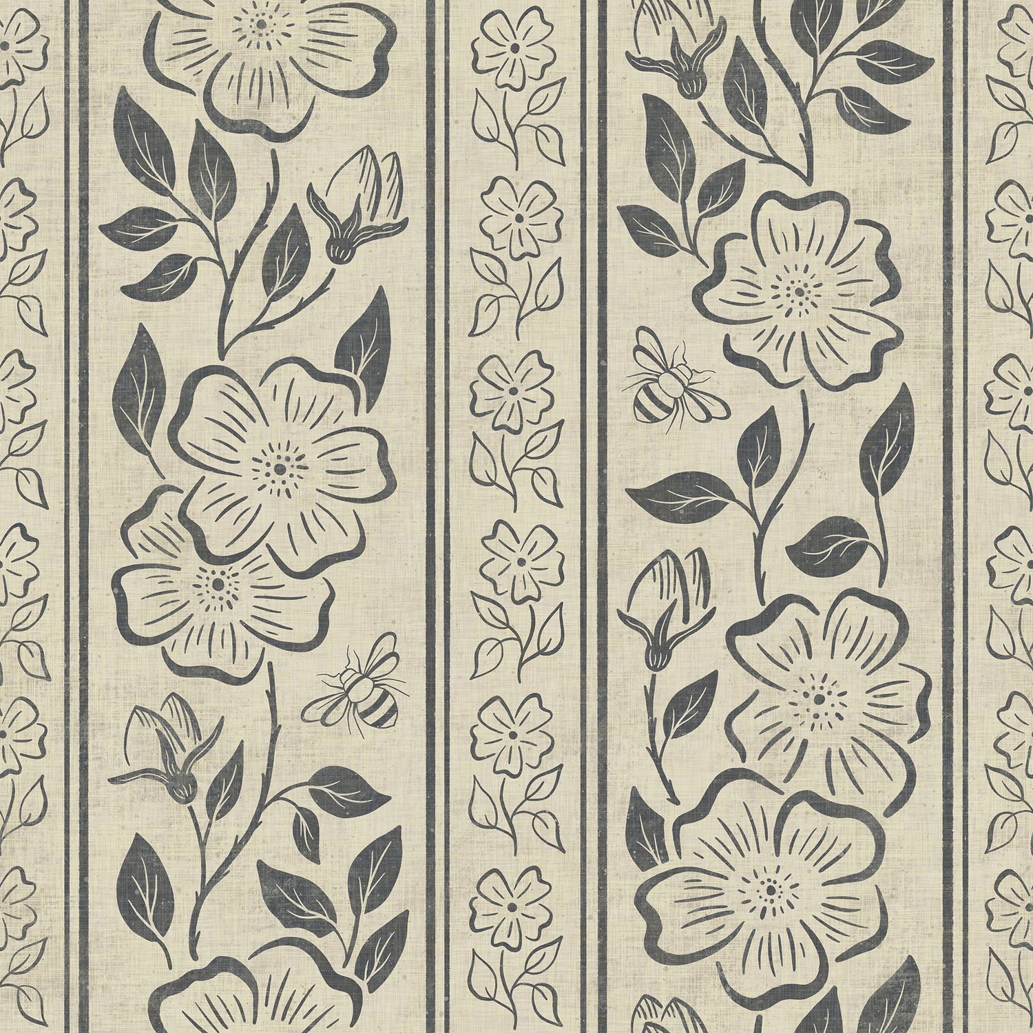 Linen Floral Stripe is a timeless vertical wallpaper featuring hand drawn botanicals, folk-style florals, and delicate bees - arranged in an alternating stripe pattern inspired by vintage textiles and artisan craft.