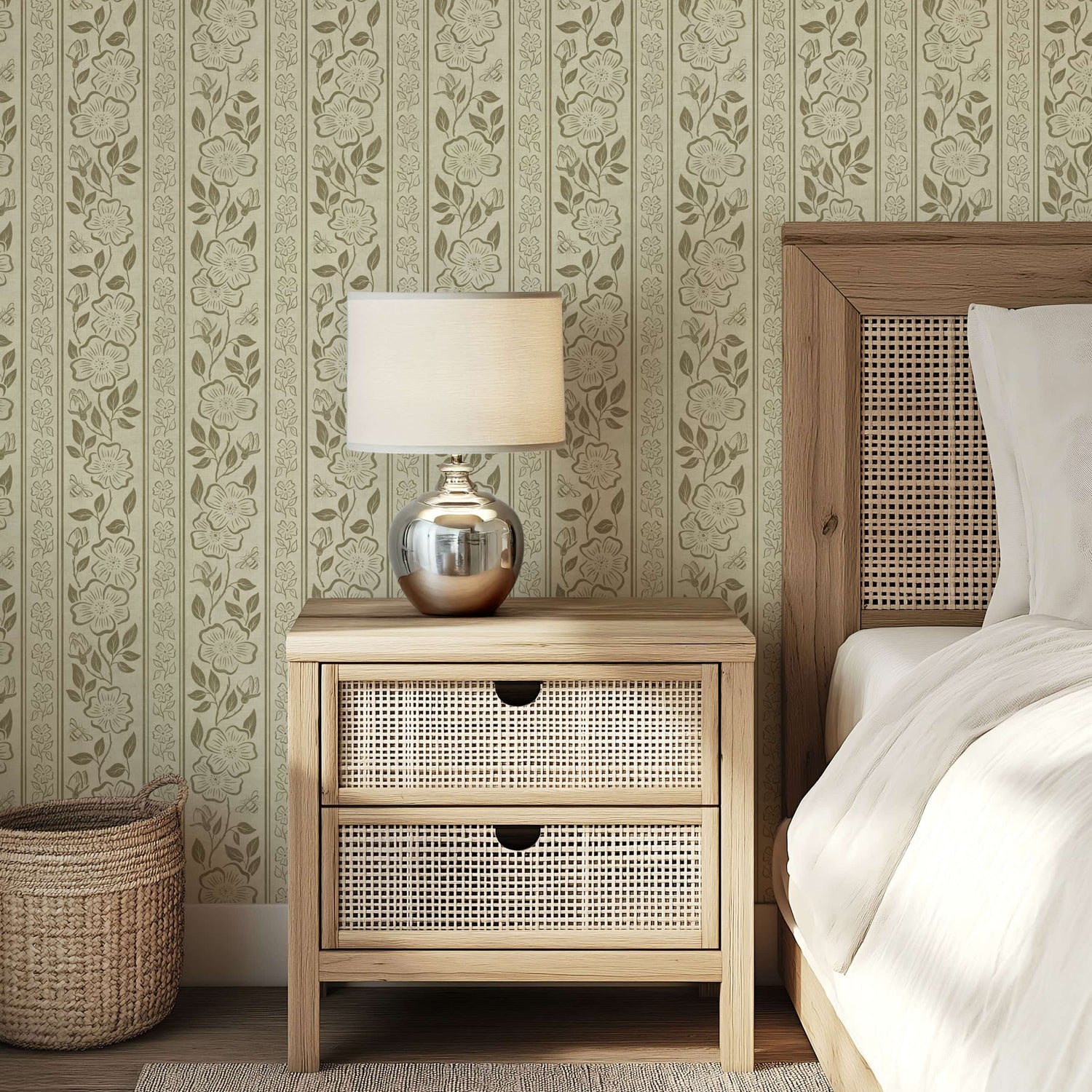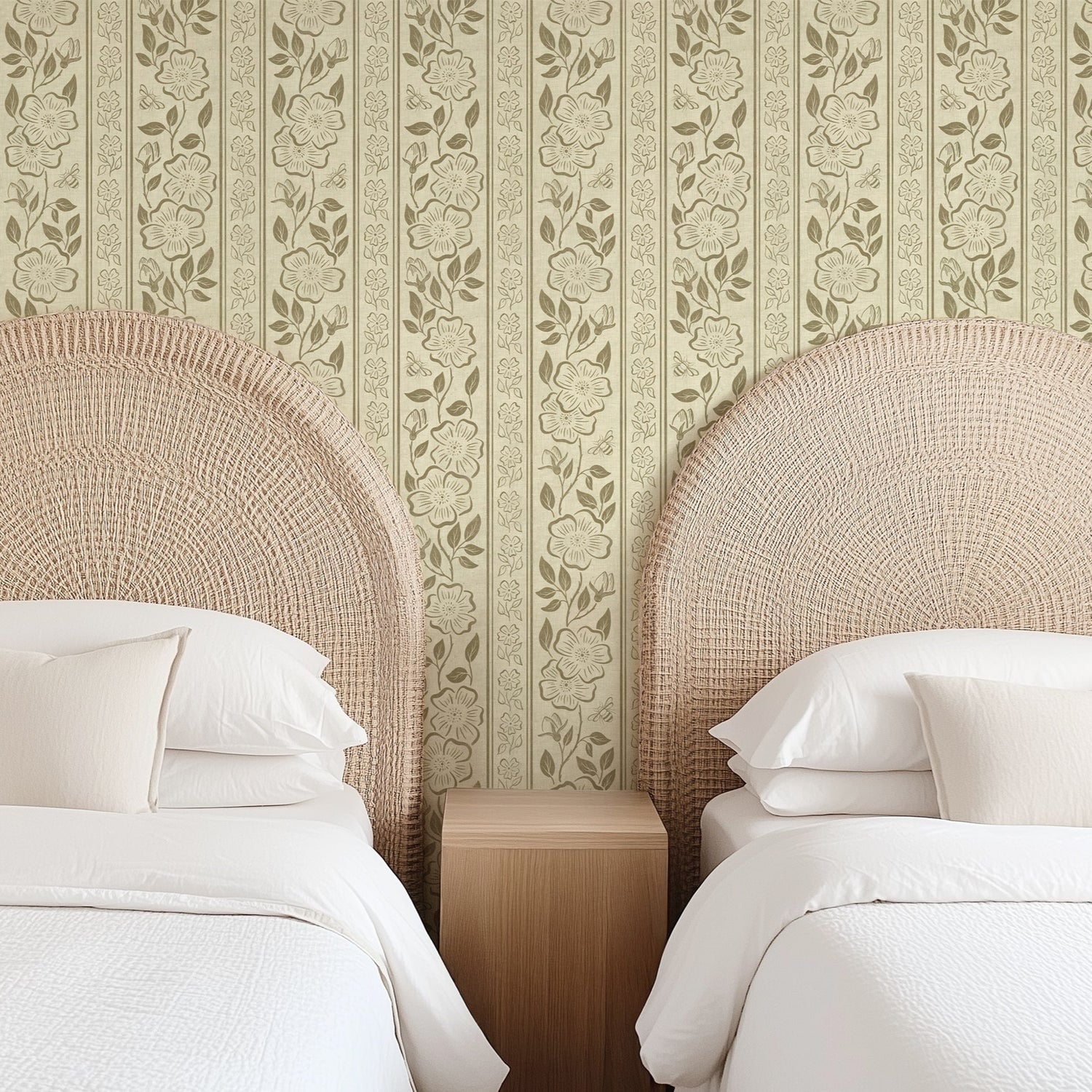 Linen Block Print Floral Stripe - Vintage Inspired Botanical Wallpaper