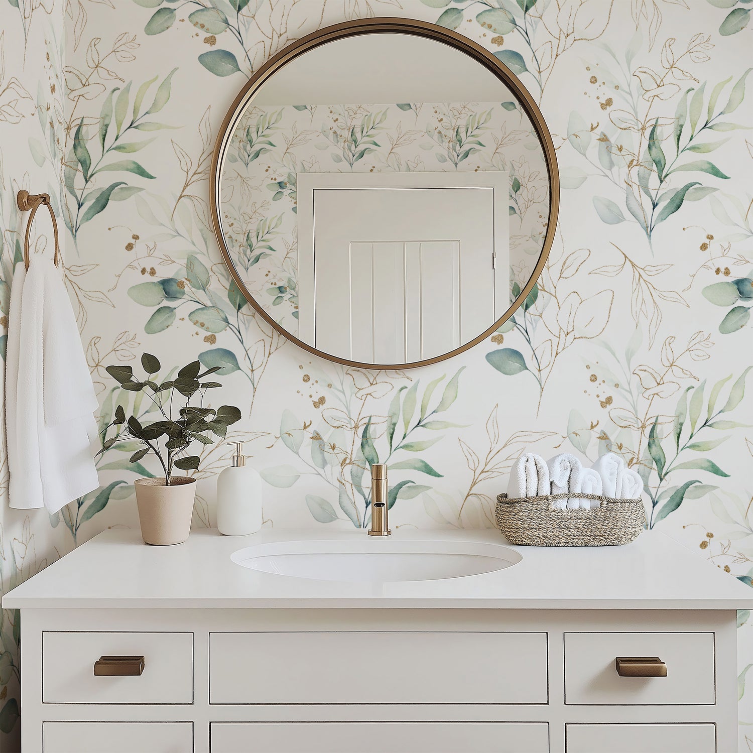 This watercolor floral wallpaper invites tranquility into your home with its soft foliage and delicate golden touches. Against a pristine white backdrop, the varied green tones of leaves interlace with the shimmering warmth of gold, creating a seamless and elegant botanical dance. This design encapsulates nature's beauty with a hint of luxury, perfect for those seeking to add a sophisticated yet gentle natural motif to their interiors.