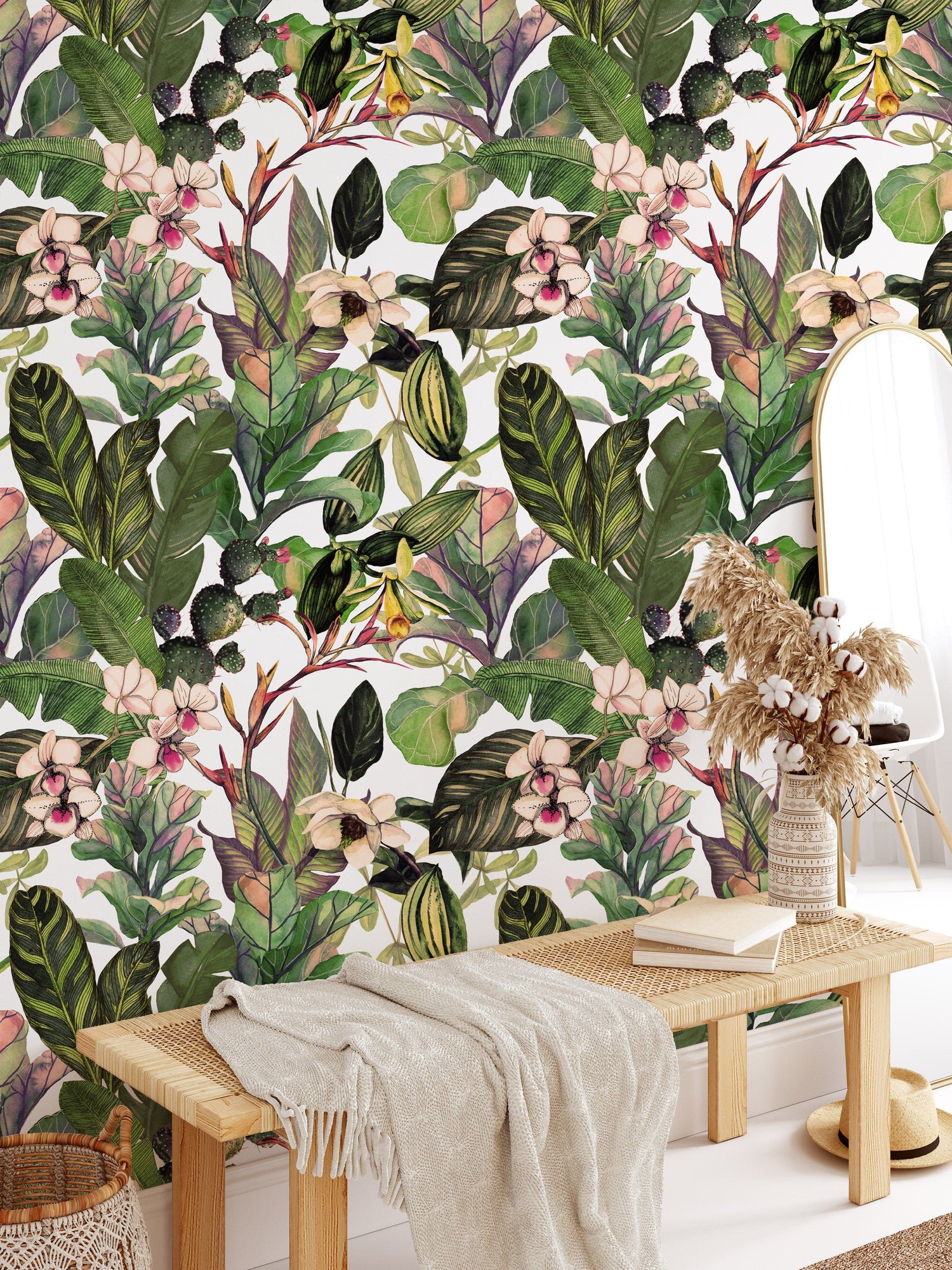 Green Tropical Leaves Wallpaper Mural - Sample: 12"W x 10"H / Smooth Vinyl Peel & Stick is backordered and will ship as soon as it is back in stock.