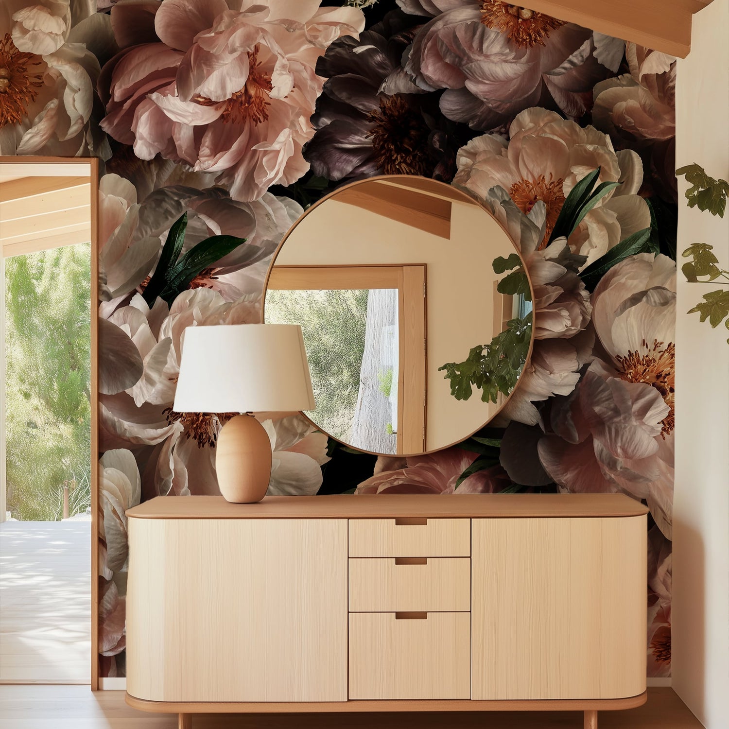 Immerse your space in the moody elegance of Midnight Bloom - a dramatic floral mural wallpaper that captures the heart of the Dark Academia aesthetic. With painterly peonies in deep blush, ivory, and rust tones blooming over a midnight-black backdrop, this design evokes vintage romance, literature, and candlelit stillness.