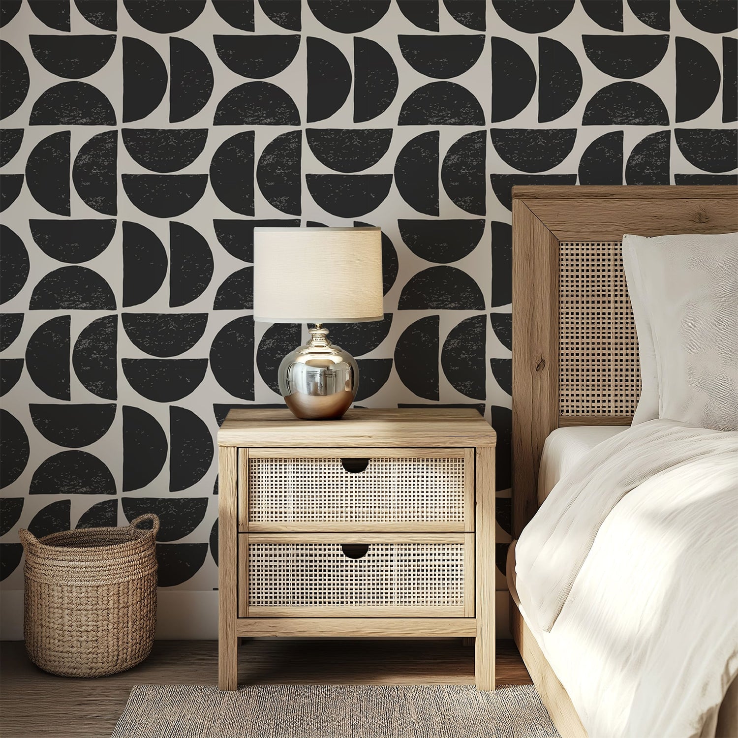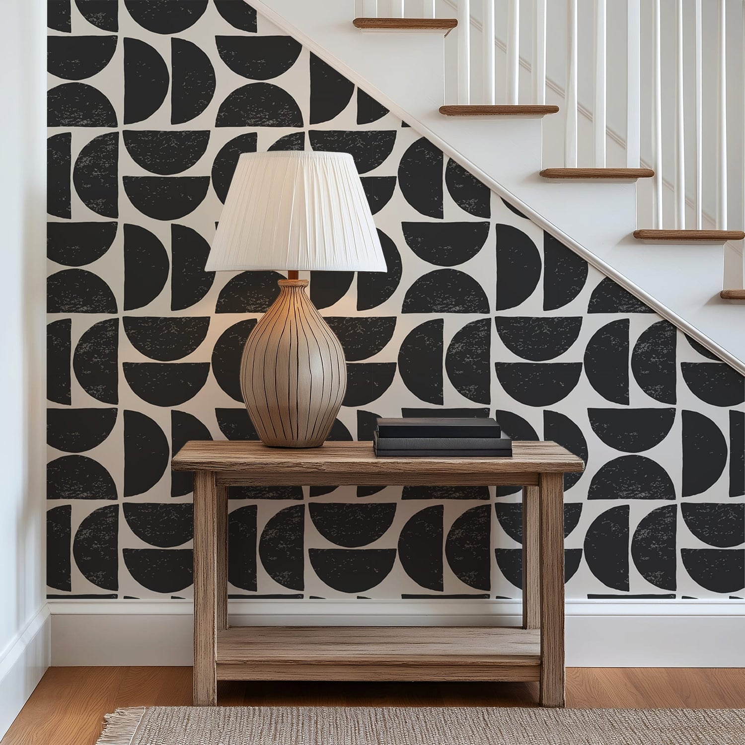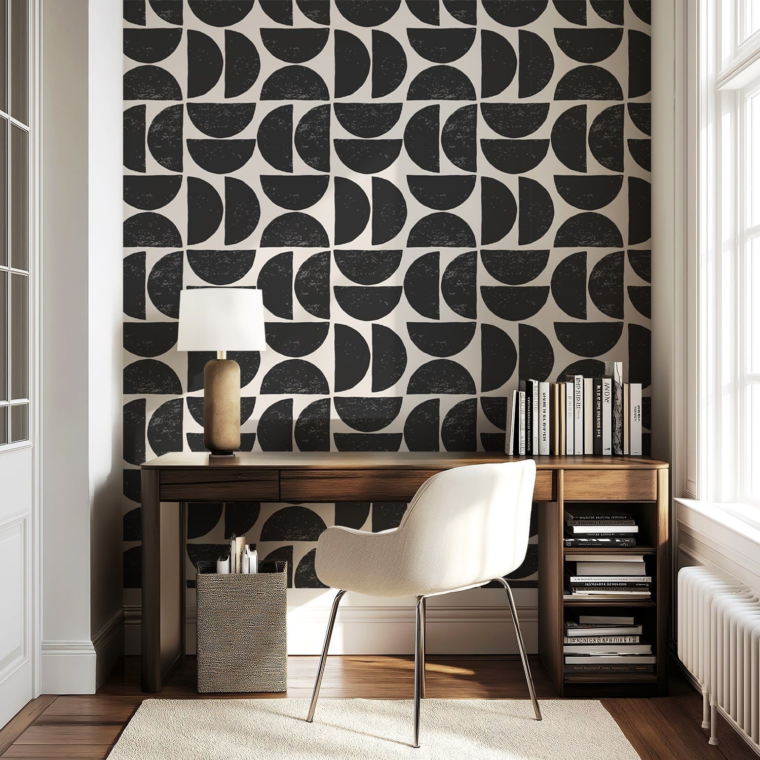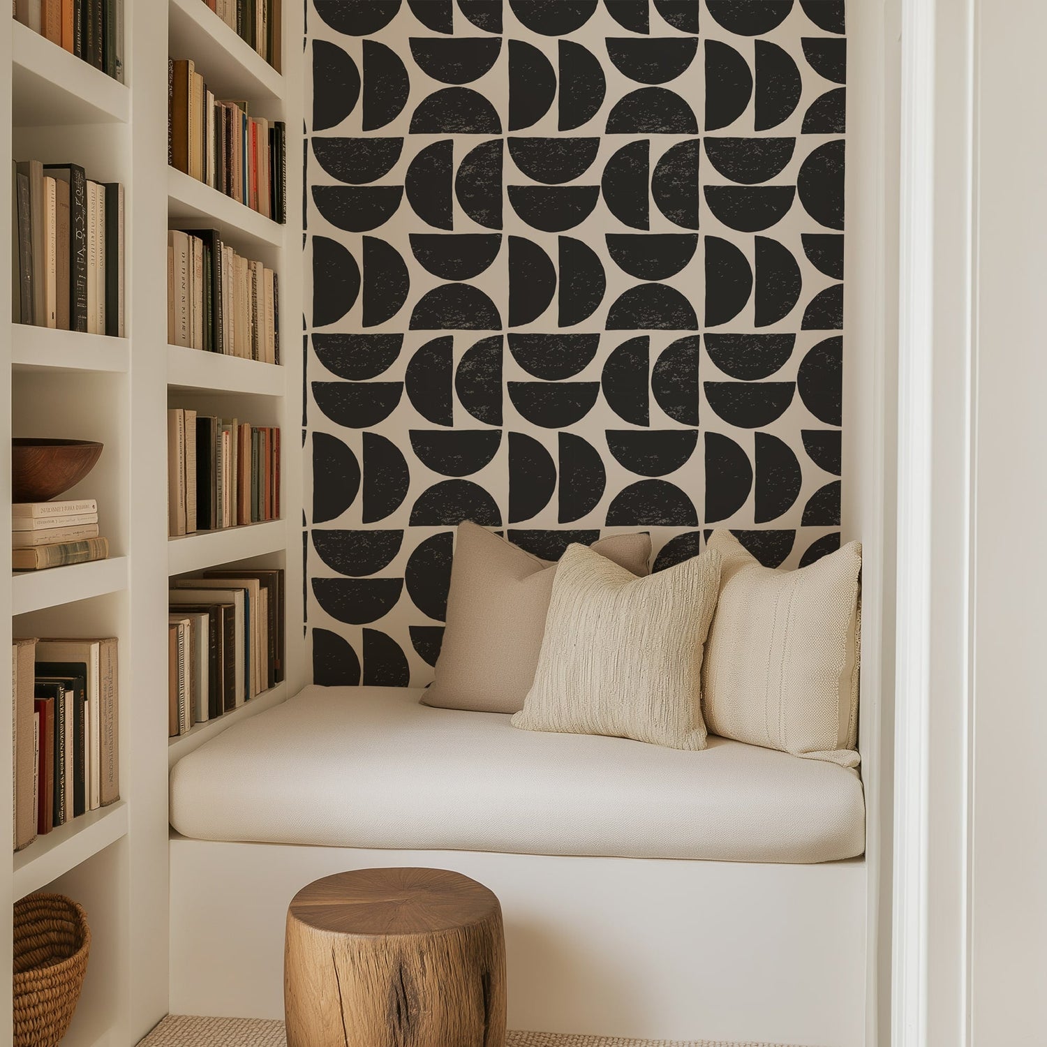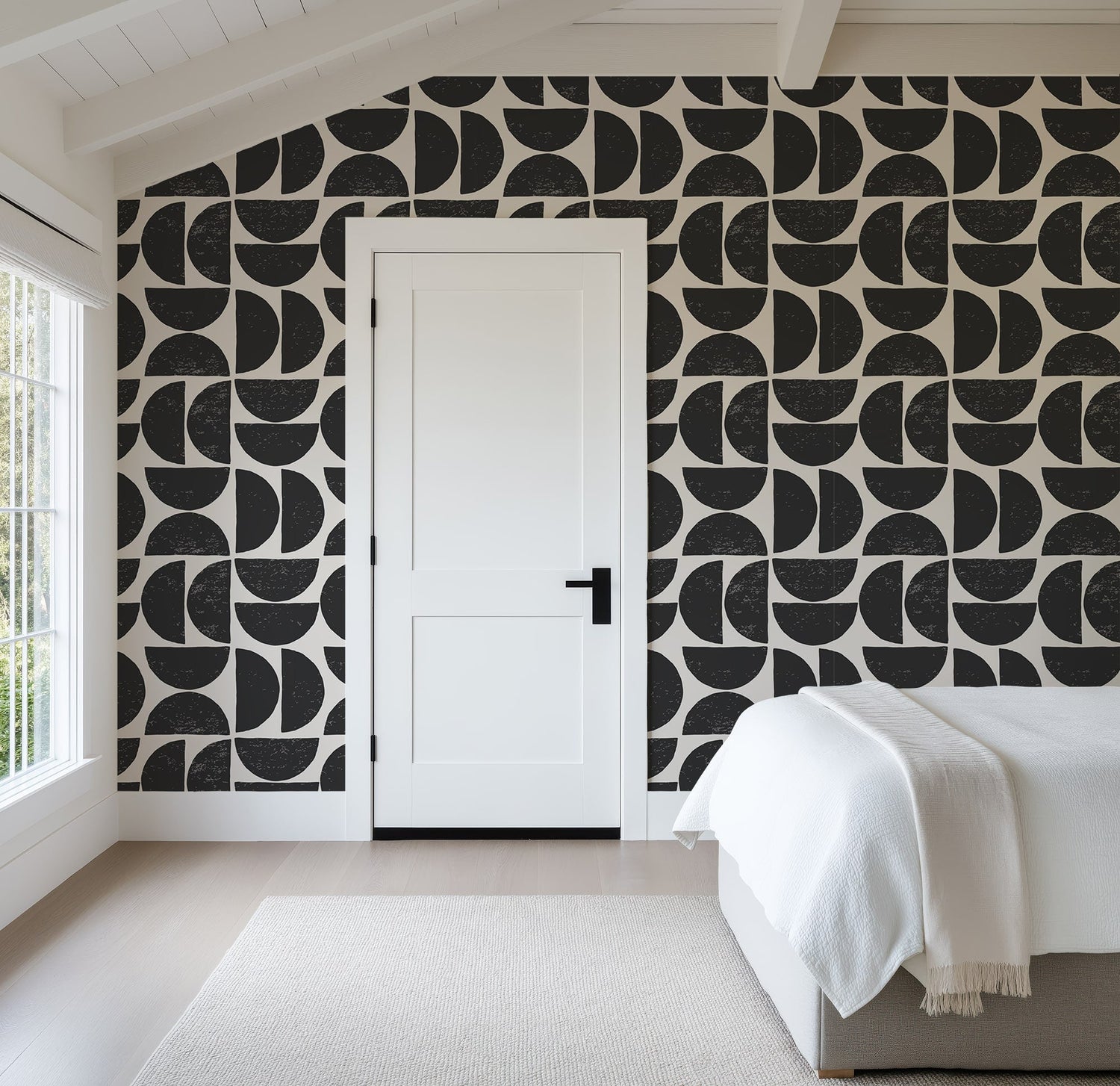 Make a fearless statement in your space with this bold geometric wallpaper, where clean lines meet hand drawn charm. Featuring striking half-circle shapes in jet black over a soft ivory background, this design blends mid-century modern inspiration with contemporary minimalism