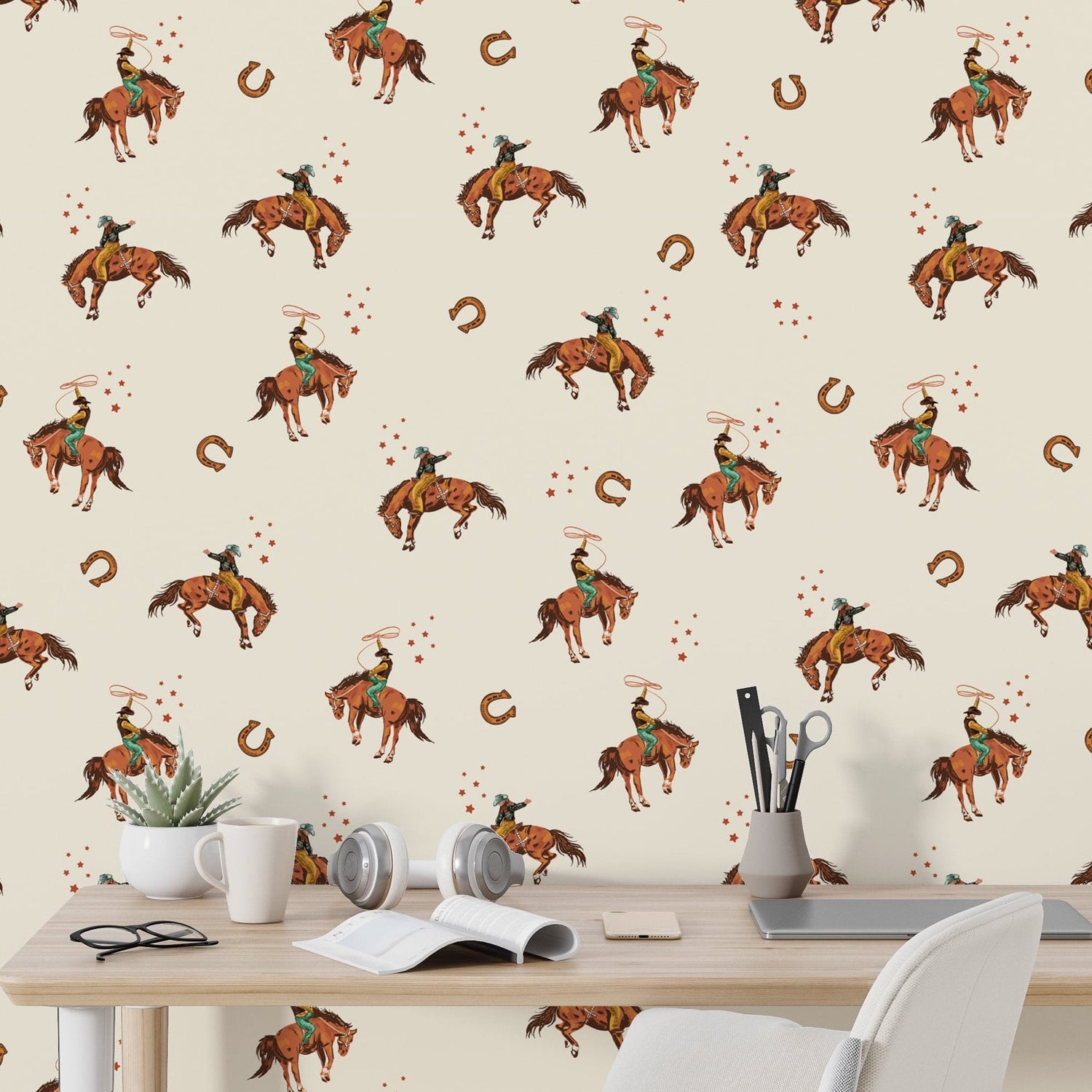Wrangle up some fun with our Western Rodeo Wallpaper, showcasing cheerful cowboys, lassos, and horseshoes in a Wild West-inspired design. Whether you're decorating a nursery, a kids' room, or even a playroom, this wallpaper brings a touch of adventure to your walls.