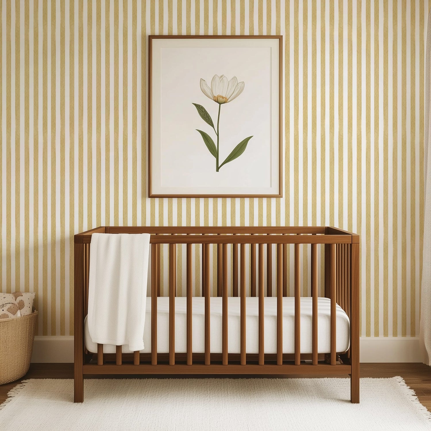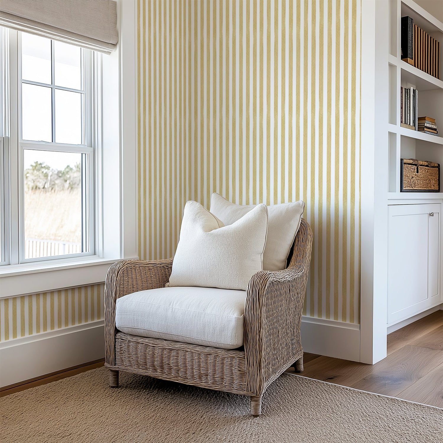 Illuminate your space with our Radiant Yellow Stripe Wallpaper, designed to infuse warmth and sophisticated style. This isn't just a stripe; it's a meticulously crafted design featuring a subtle, organic texture within each warm, golden yellow band, reminiscent of hand-painted artistry.
