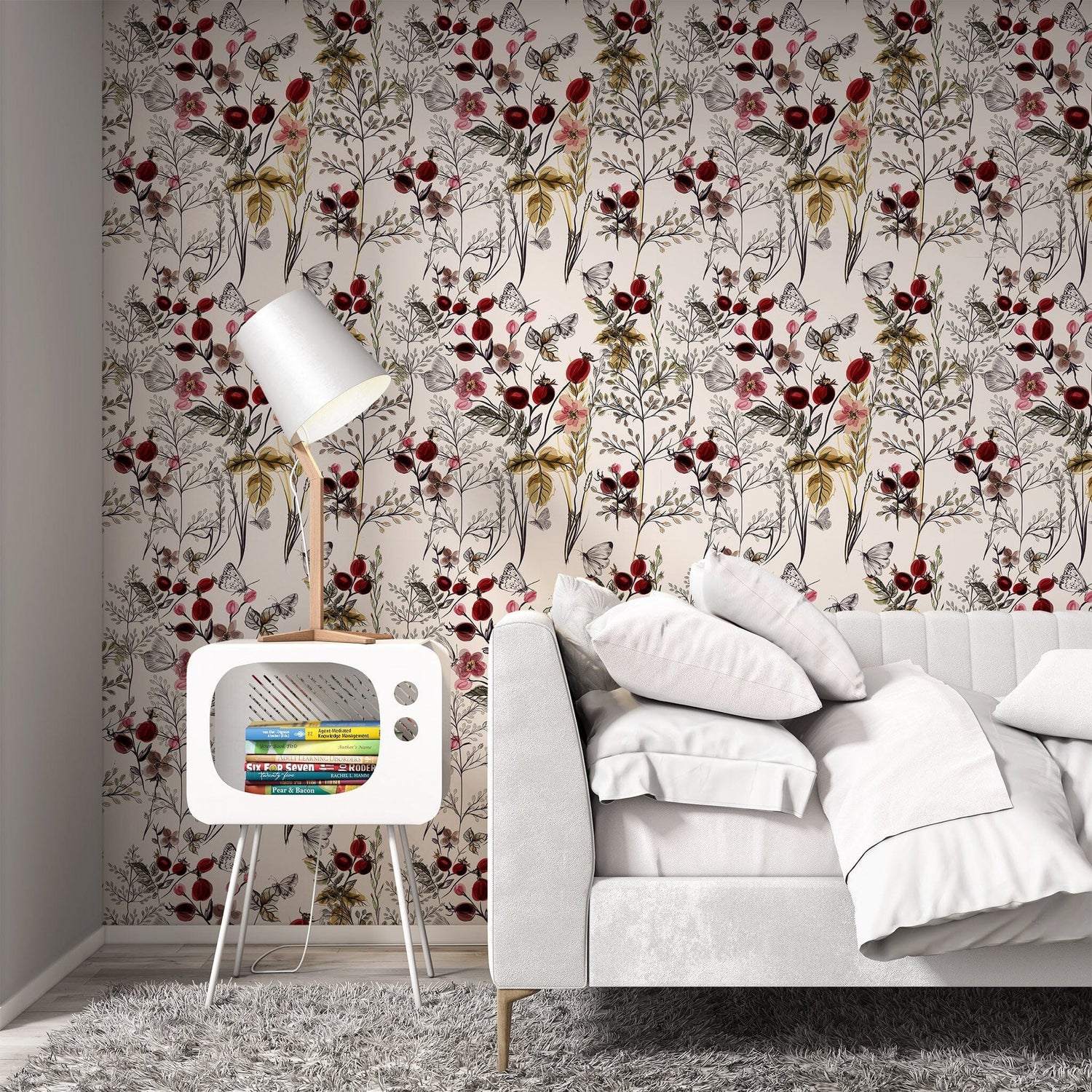 Red Flower Rose Hip Wallpaper adds a vibrant and classic touch to any room. Peel and stick removable vinyl makes installation and removal quick and easy. Get a unique look with lasting durability for any space - perfect for a DIY project for at home or office.