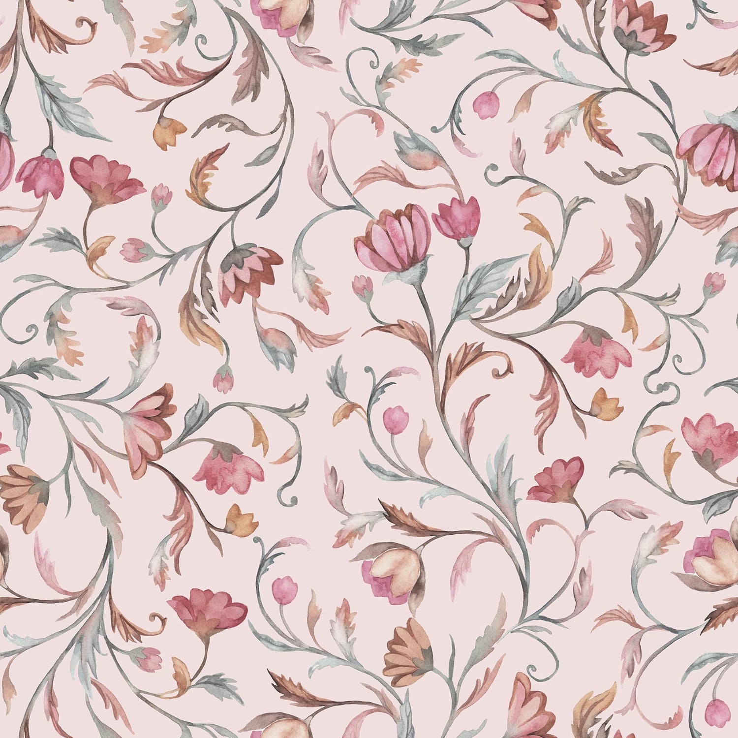 Breathe softness into your space with Rose Blush Botanica - a delicate floral wallpaper in a warm blush pink hue, hand painted in timeless watercolor strokes. Each bloom curls with quiet charm, while trailing vines in rosewood, sage, and dusty coral add effortless rhythm and movement.