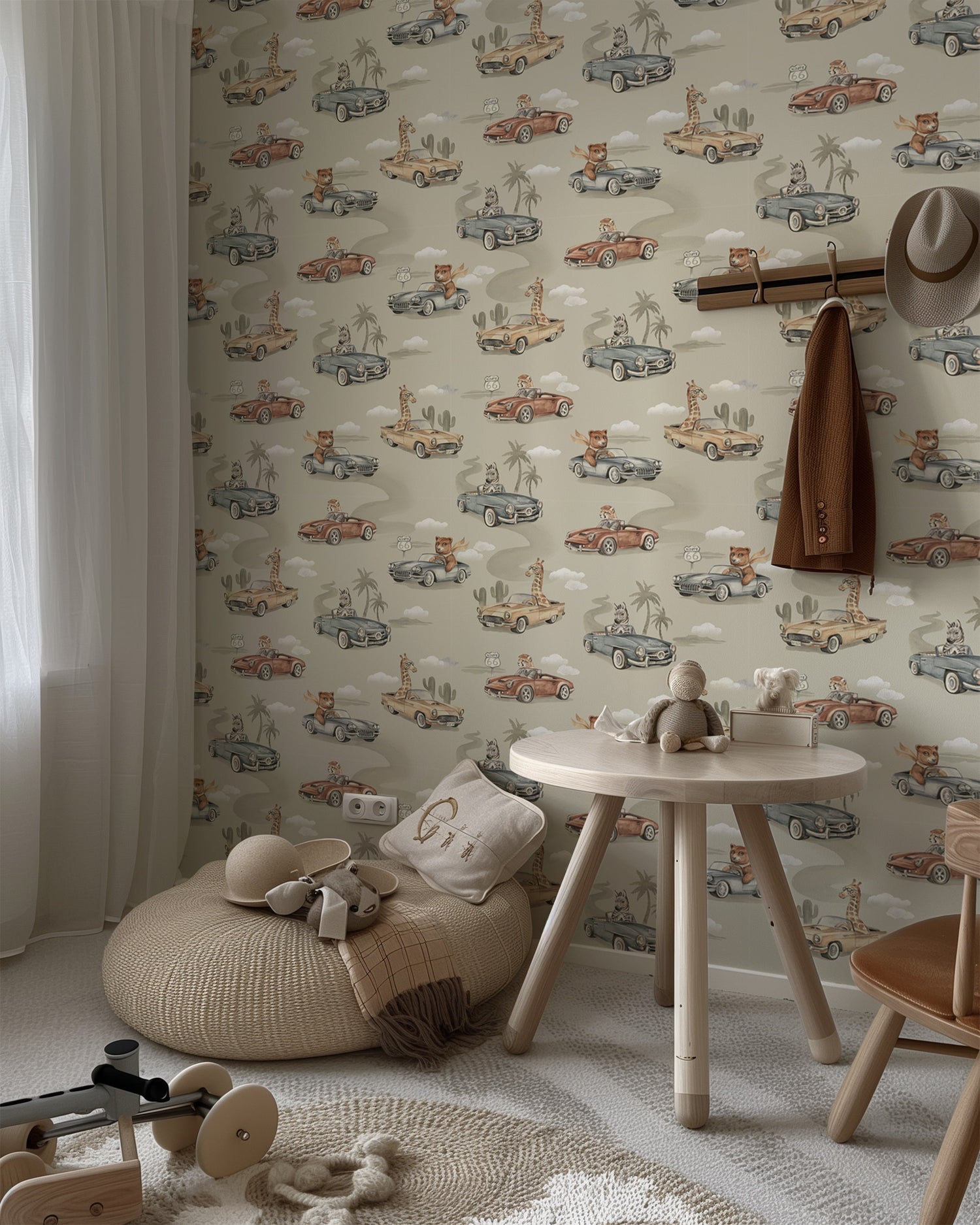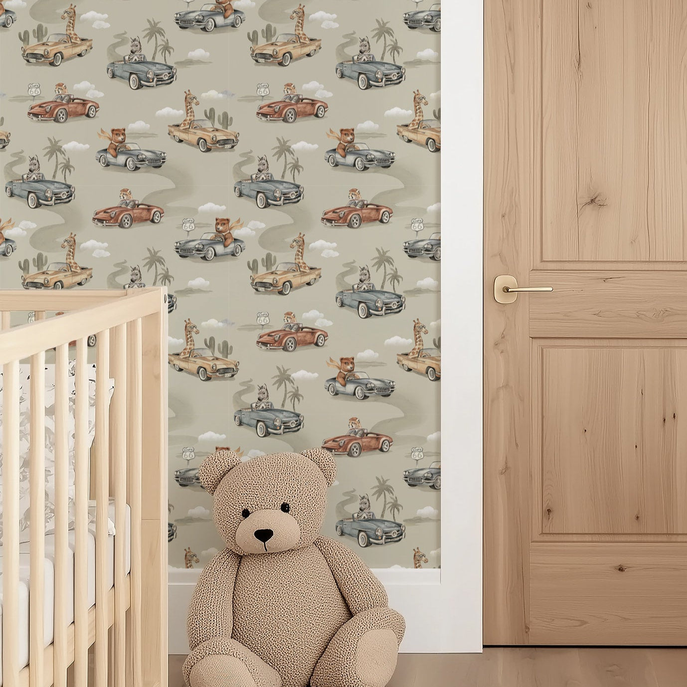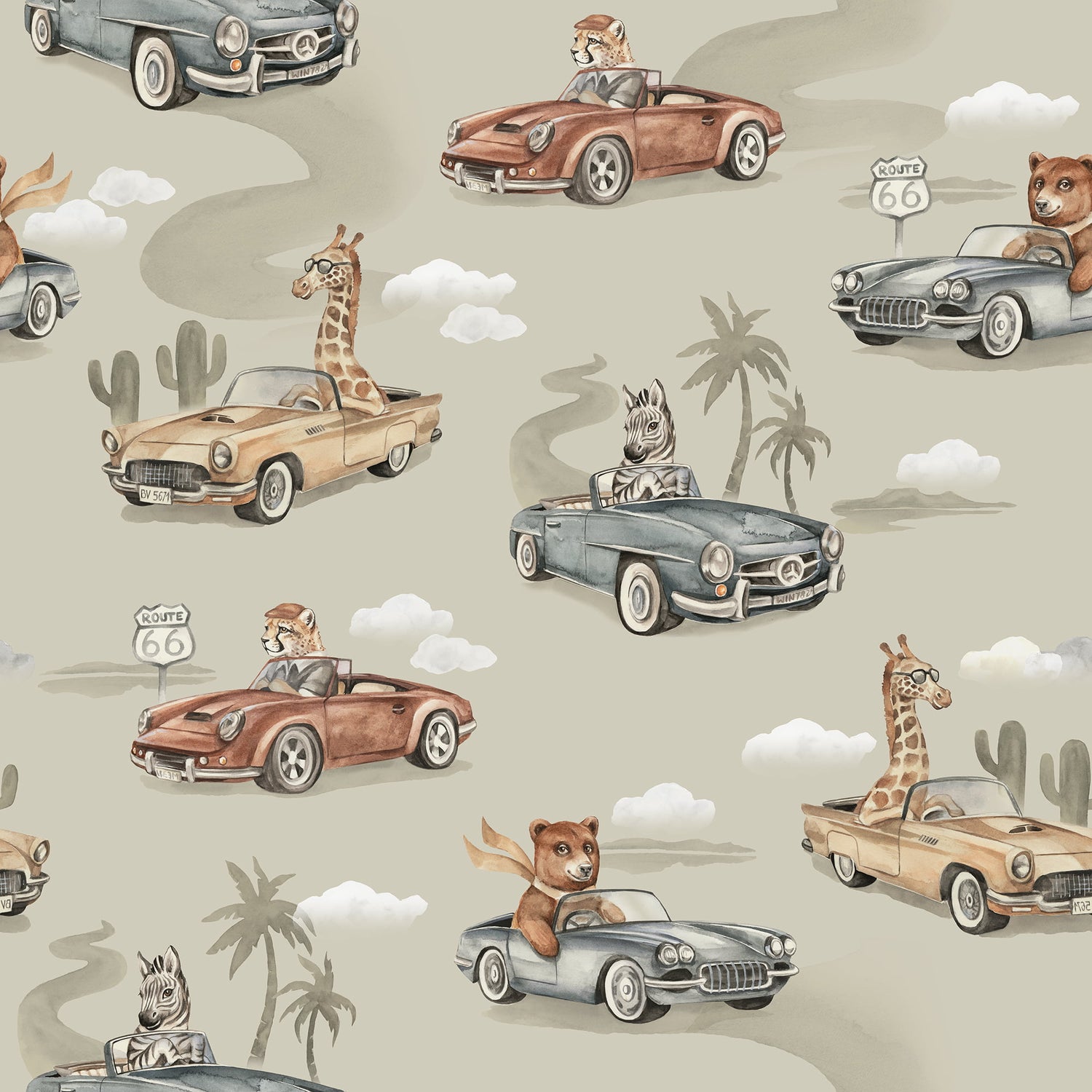 Bring warmth and whimsy into your child’s space with our Route 66 Kids Safari Wallpaper in Beige. Playful giraffes, zebras, tigers, and bears drive vintage cars along America’s most iconic highway, creating a cheerful repeating pattern full of character.