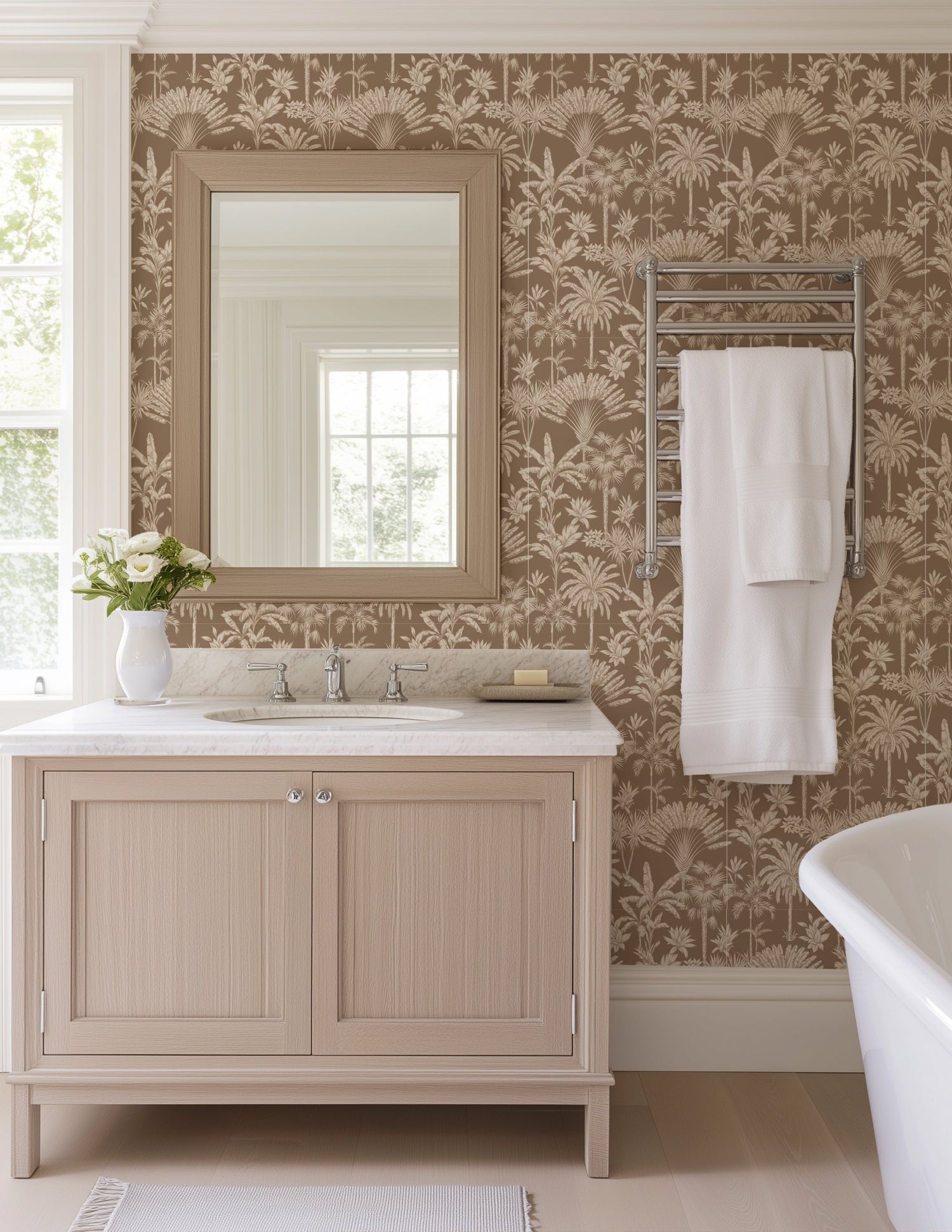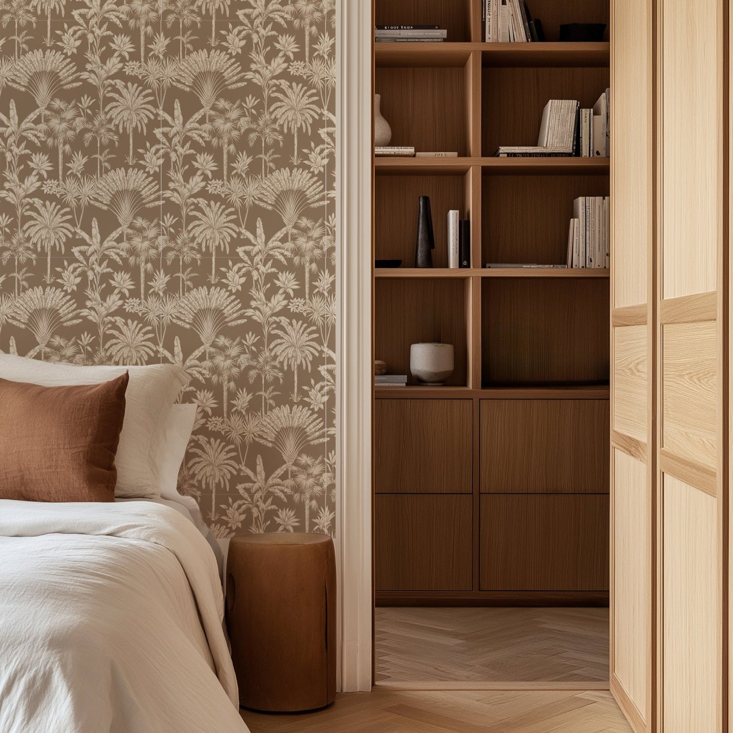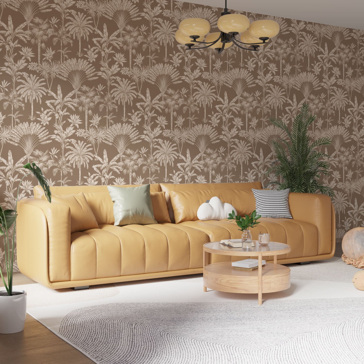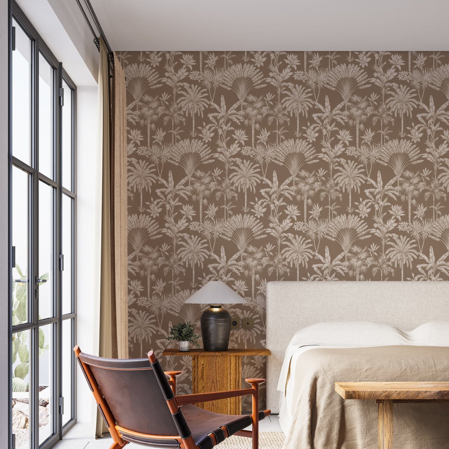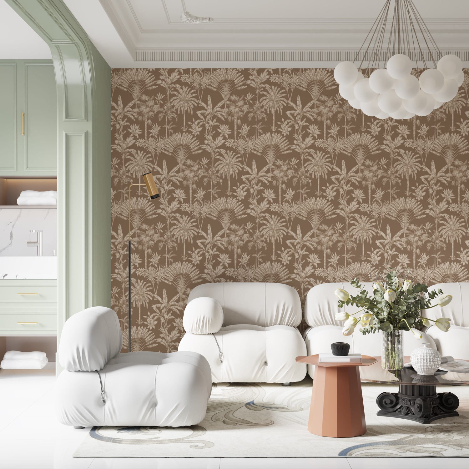 Transform your space with EazzyWalls sophisticated Tropical Foliage Wallpaper, featuring intricate linear illustrations of lush palms and foliage. The warm neutral tones and detailed botanical patterns evoke a timeless elegance, perfect for creating a serene yet striking backdrop in your home or commercial interiors. Ideal for living rooms, bedrooms, or office spaces, this design adds a touch of classic tropical charm with a modern twist.