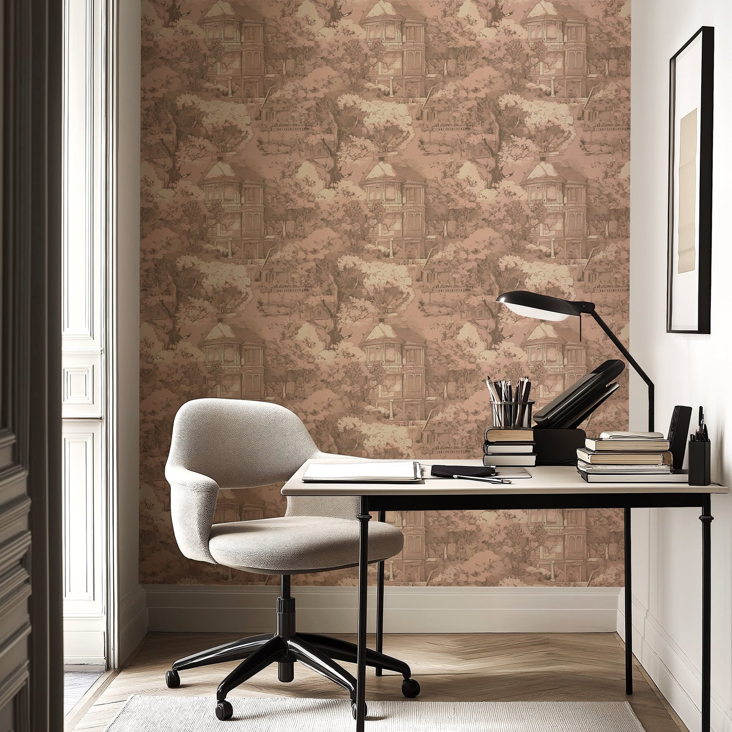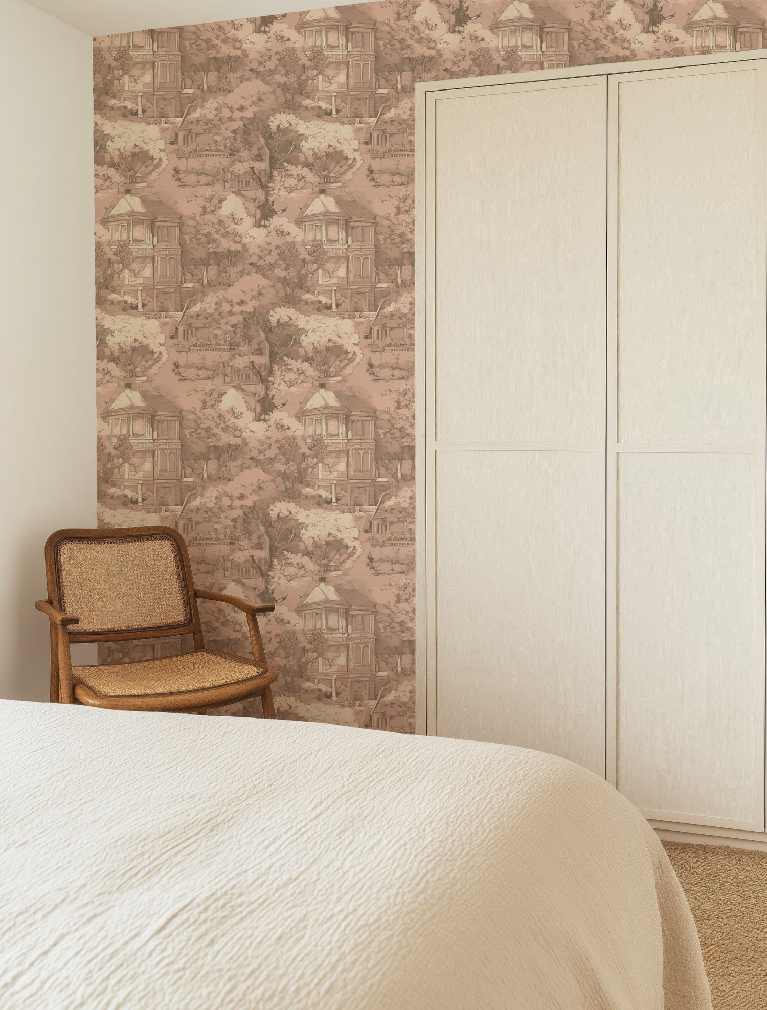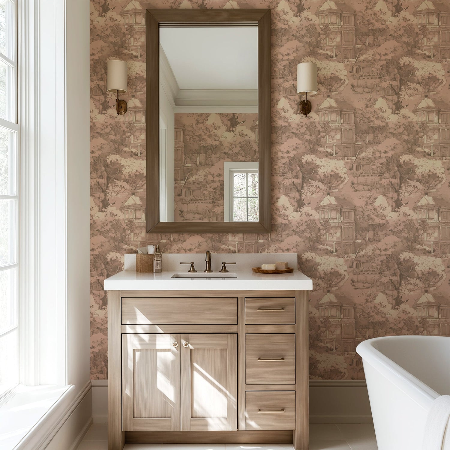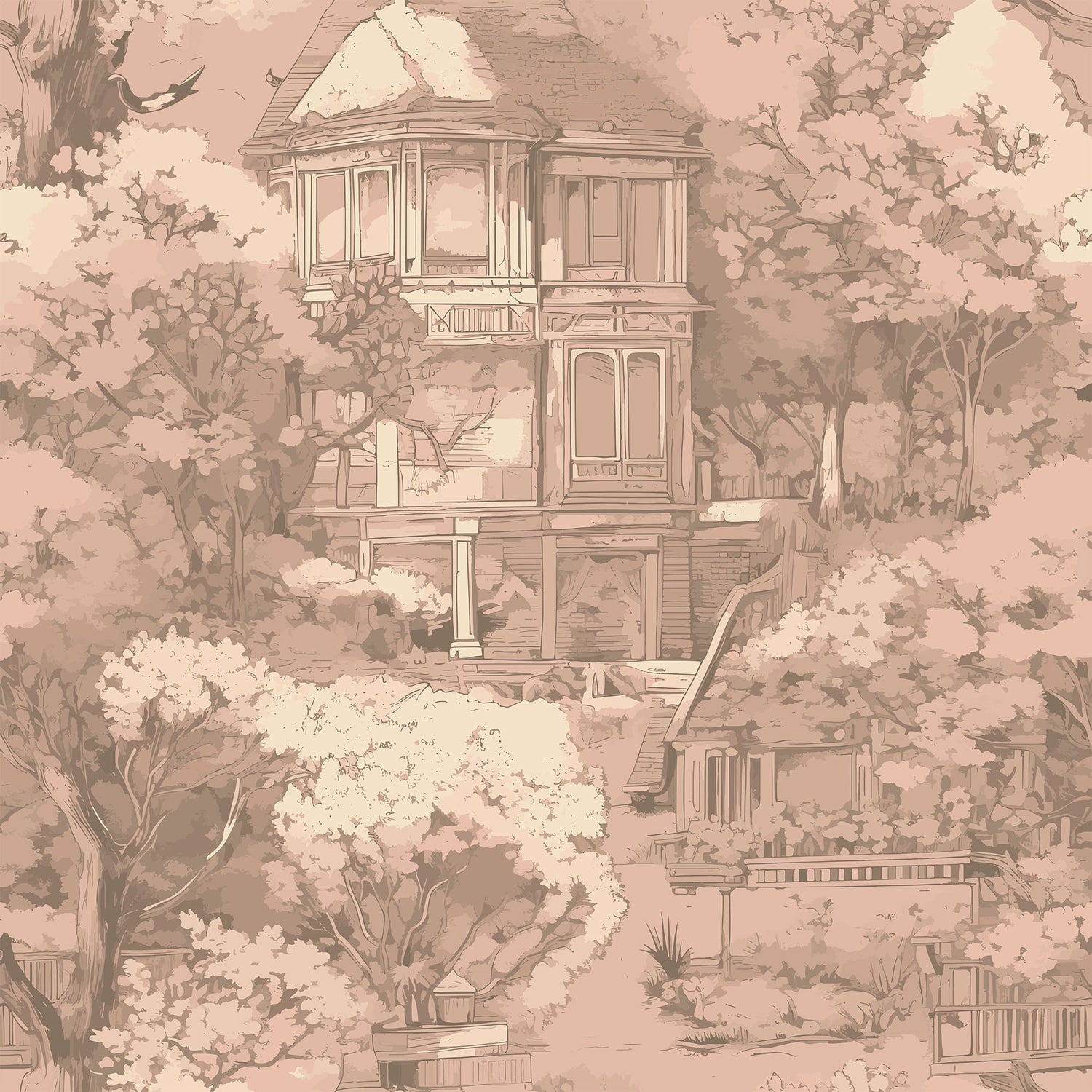 Step into a dreamlike garden with this elegant French toile wallpaper, featuring hand illustrated trees, a grand countryside manor, and poetic scenery in soft blush and warm sepia tones. Designed to evoke timeless romance, this mural brings a sense of stillness, nostalgia, and refined beauty to any space.