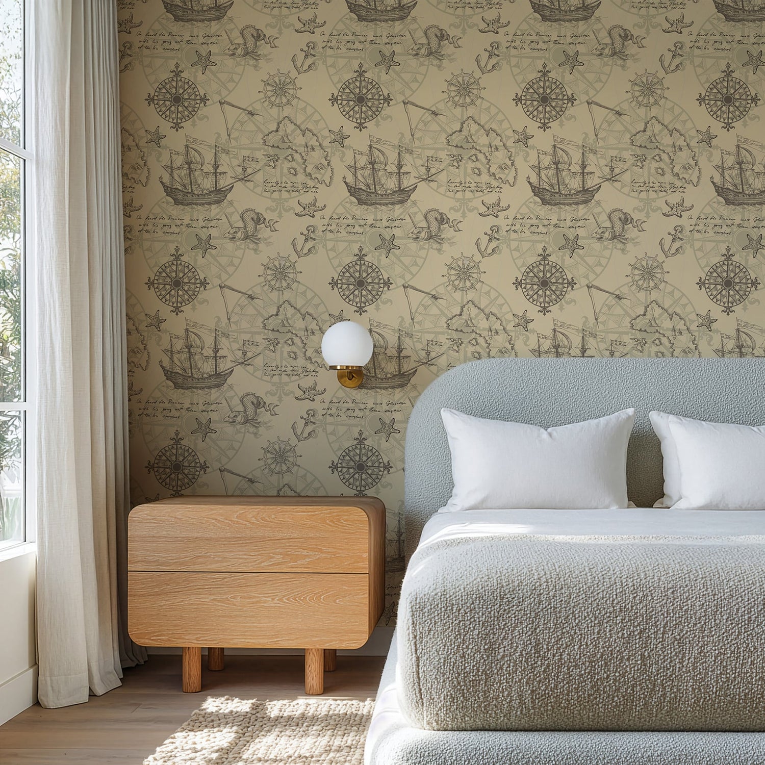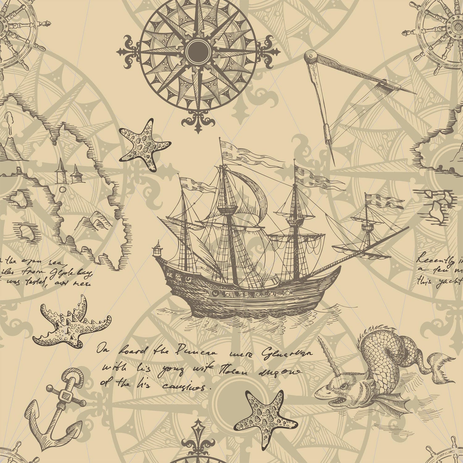 Transform your walls into a story of exploration with our Vintage Nautical Compass Rose Wallpaper. This beautifully illustrated design features antique sailing ships, compass roses, sea creatures, anchors, and starfish motifs, all set against a parchment-inspired background. Perfectly blending classic maritime style with old-world artistry, it evokes the romance of ocean voyages and timeless cartography.