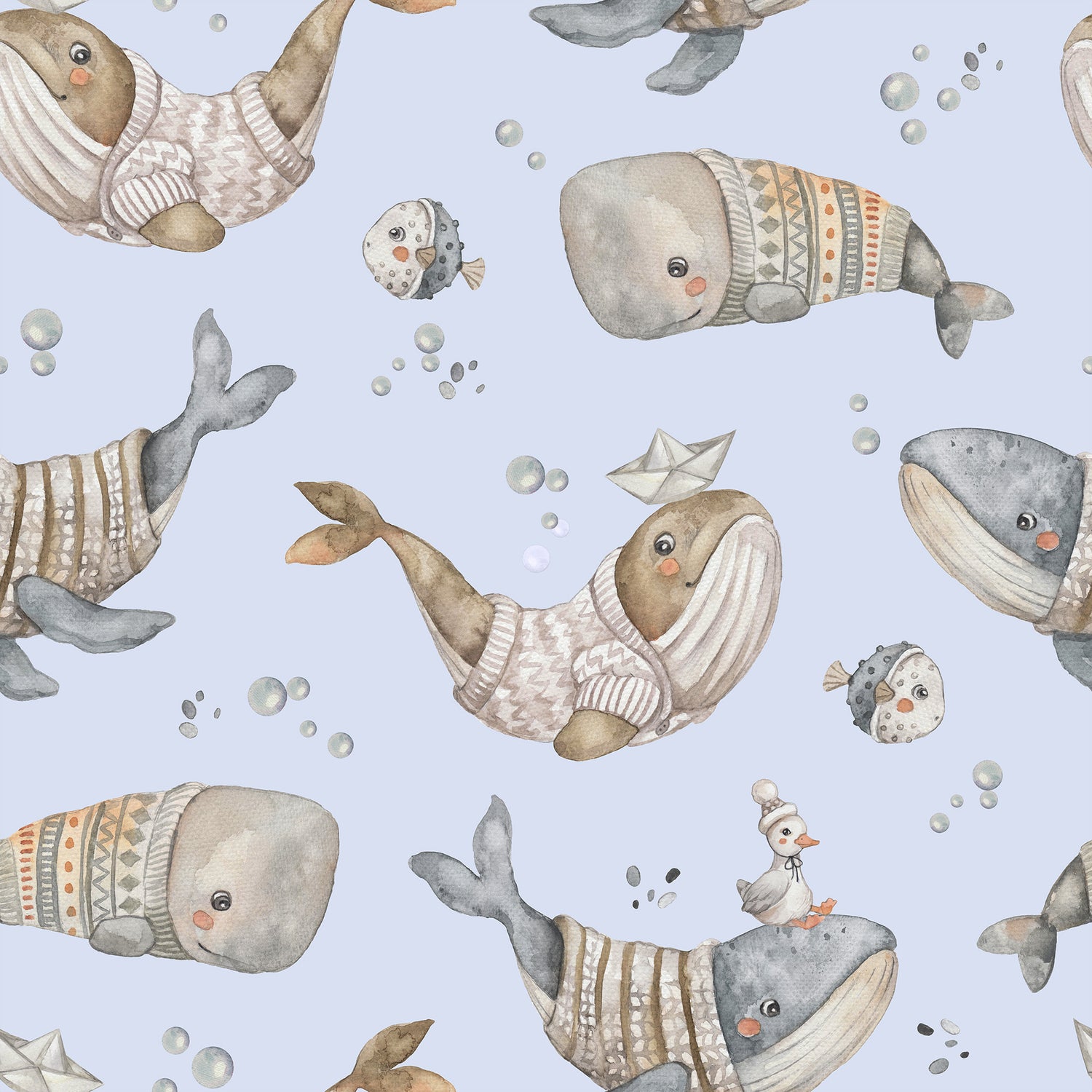 Set sail on a sea of imagination with our Whale Kids Wallpaper in Light Blue. This charming pattern features watercolor whales in cozy sweaters, playful puffers, paper boats, and a cheerful seagull. The soft blue background creates a calming coastal vibe, perfect for bringing both comfort and creativity into your child’s room.