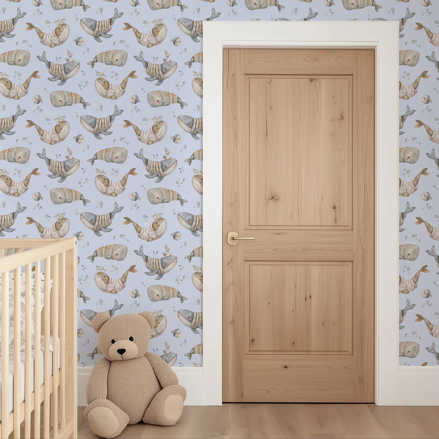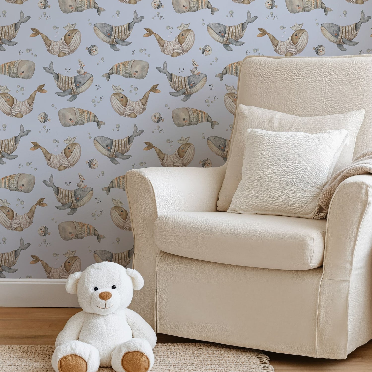 Whale Kids Wallpaper – Whimsical Nautical Adventure in Light Blue