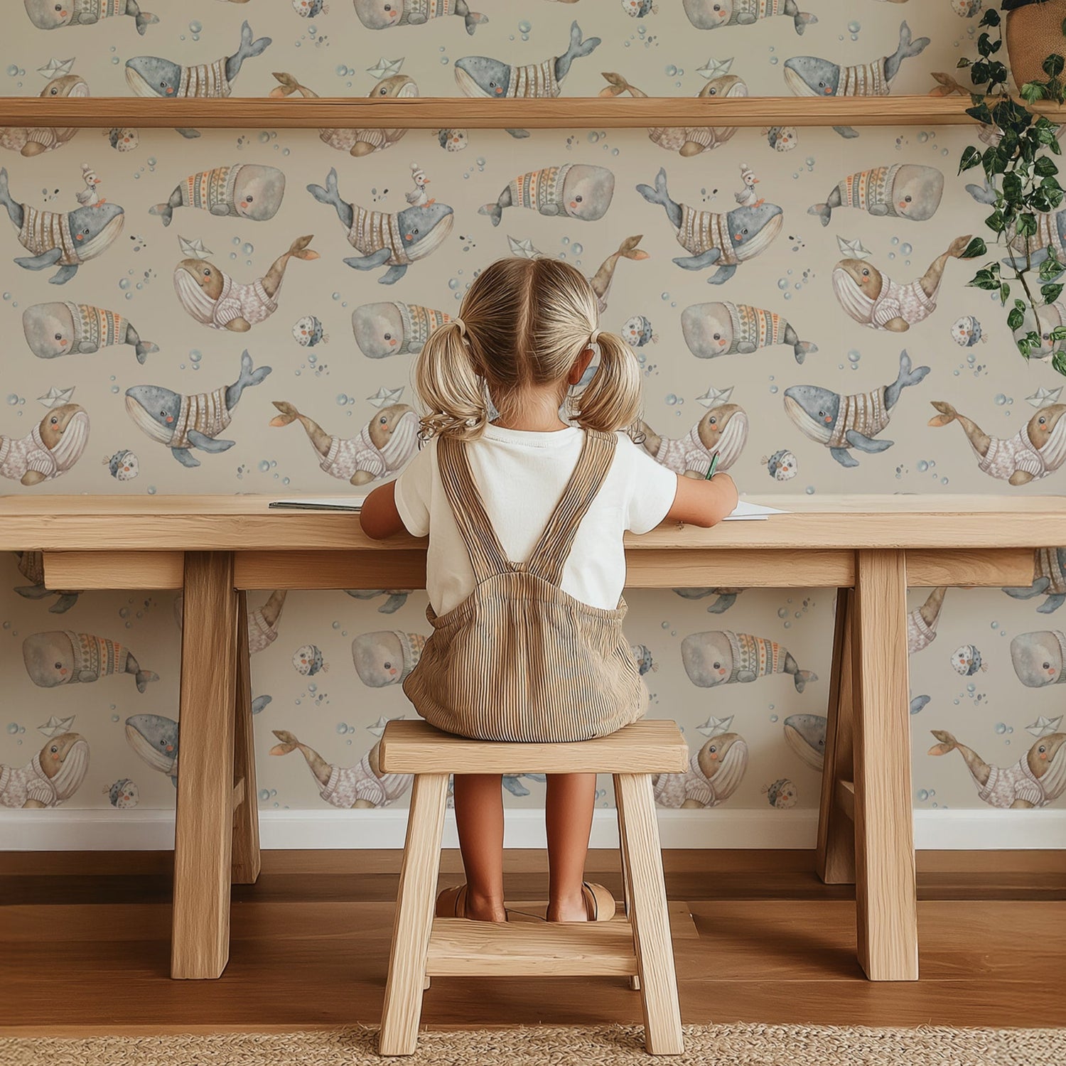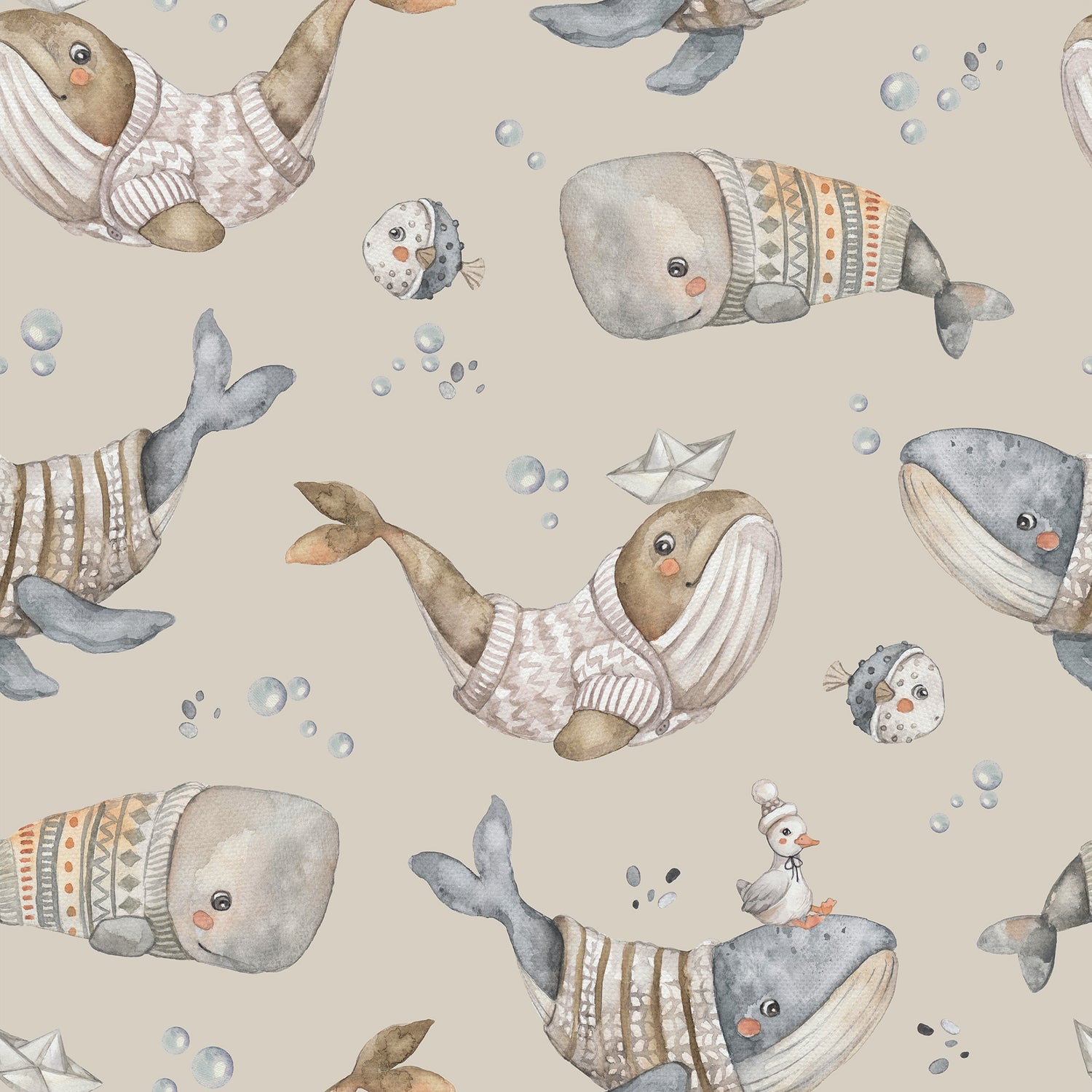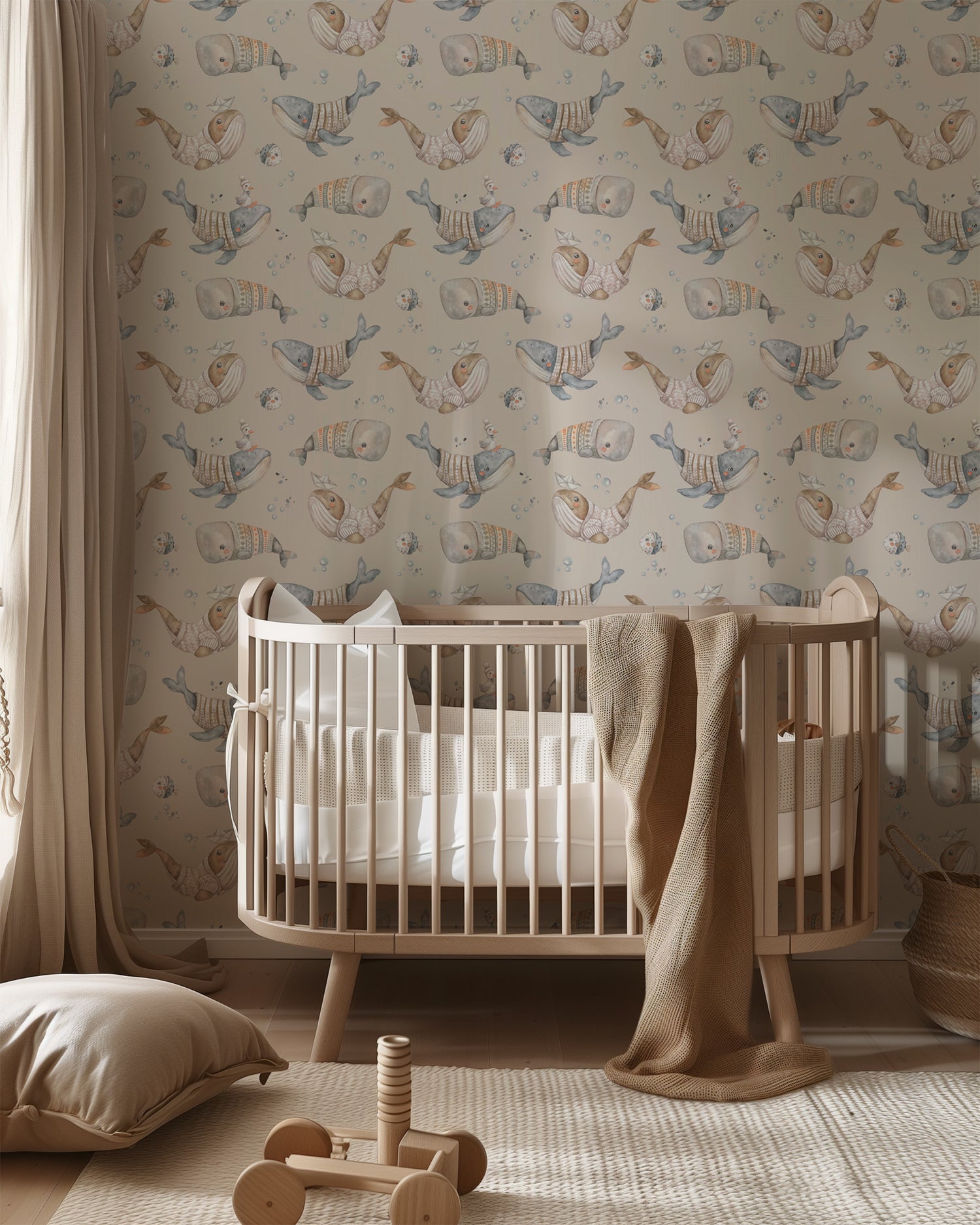 Whimsical Whale Kids Wallpaper – Cozy Ocean Adventure in Beige