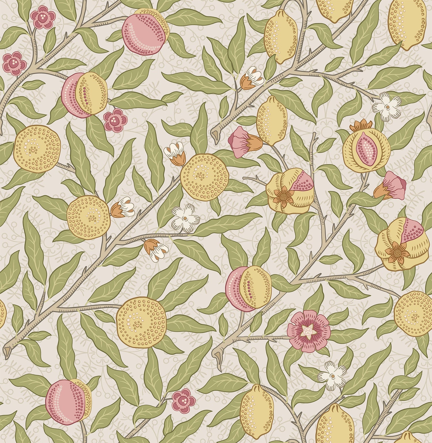 Embrace the timeless charm of William Morris with our vintage-inspired fruit wallpaper. This peel and stick wallpaper features a delightful array of lemons, pomegranates, and oranges in soft shades of yellow, pink, and green against a light background. The intricate foliage and floral details are reminiscent of Morris's iconic craftsmanship, bringing a touch of classic elegance to your walls.